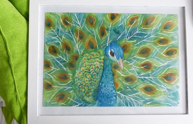 Akwarela Paw o kolorystyce niebiesko-zielonej, o wymiarach 36X25 cm, namalowana na papierze akwarelowym Arches (100% bawełny), sygnowana. W zależności od dobranej ramy może pasować do wnętrz o różnorakiej stylistyce.