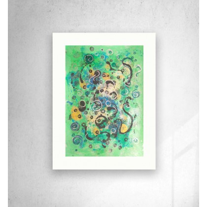 Abstrakcyjna, dynamiczna kompozycja. Oryginalna grafika, ręcznie wykonana w technice monotypii na grubym papierze (270 gsm) z użyciem farb akrylowych. Praca naklejona na jasne tło w rozmiarze 30x40 cm, oznakowana inicjałami A.S. Obrazek można dowolnie zawiesić - w pionie lub poziomie. Pracę wystarczy samemu oprawić w antyramę lub fotoramę w podanym rozmiarze. Abstrakcja będzie się dobrze prezentować na ścianie wraz z innymi grafikami z tej serii.