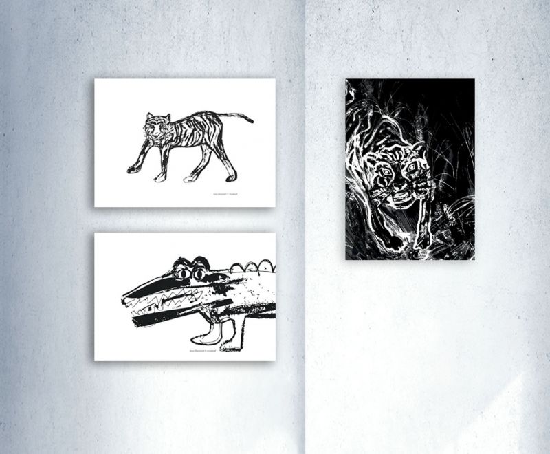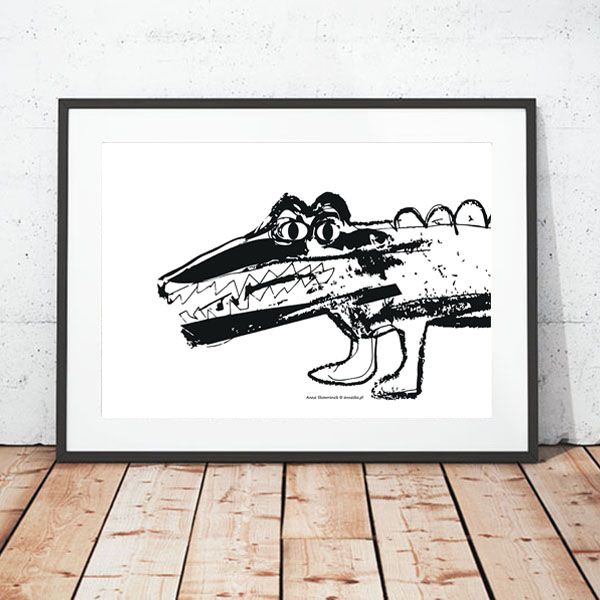 Czarno-biały, zabawny plakat z krokodylem. Autorska ilustracja, wydruk na grubym papierze formatu 21 x 30 cm. Print należy samodzielnie oprawić (zdjęcie w ramce jest poglądowe). Poster sprzedawany jest bez ramki, bez passepartout. Cena dotyczy 1 sztuki. Fotografie w zestawie innych grafik są poglądowe.