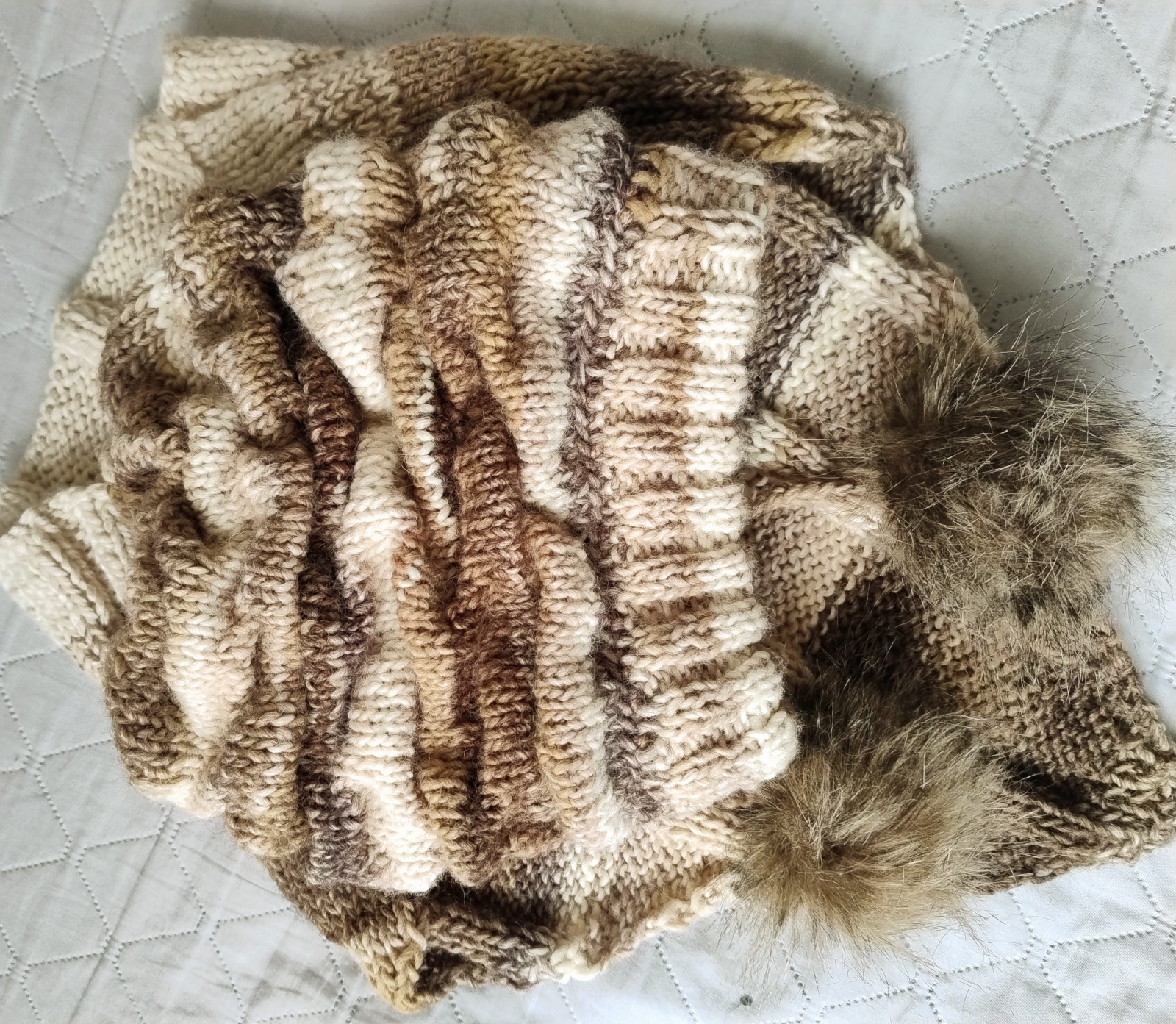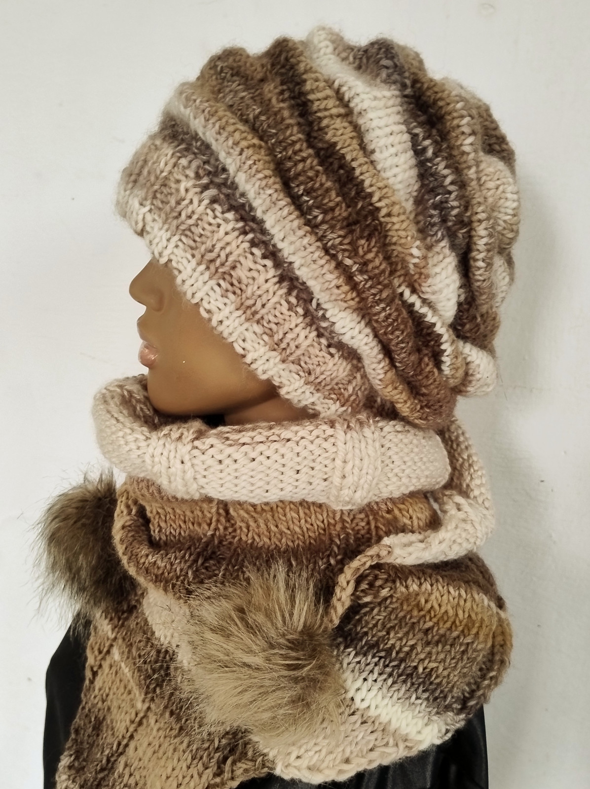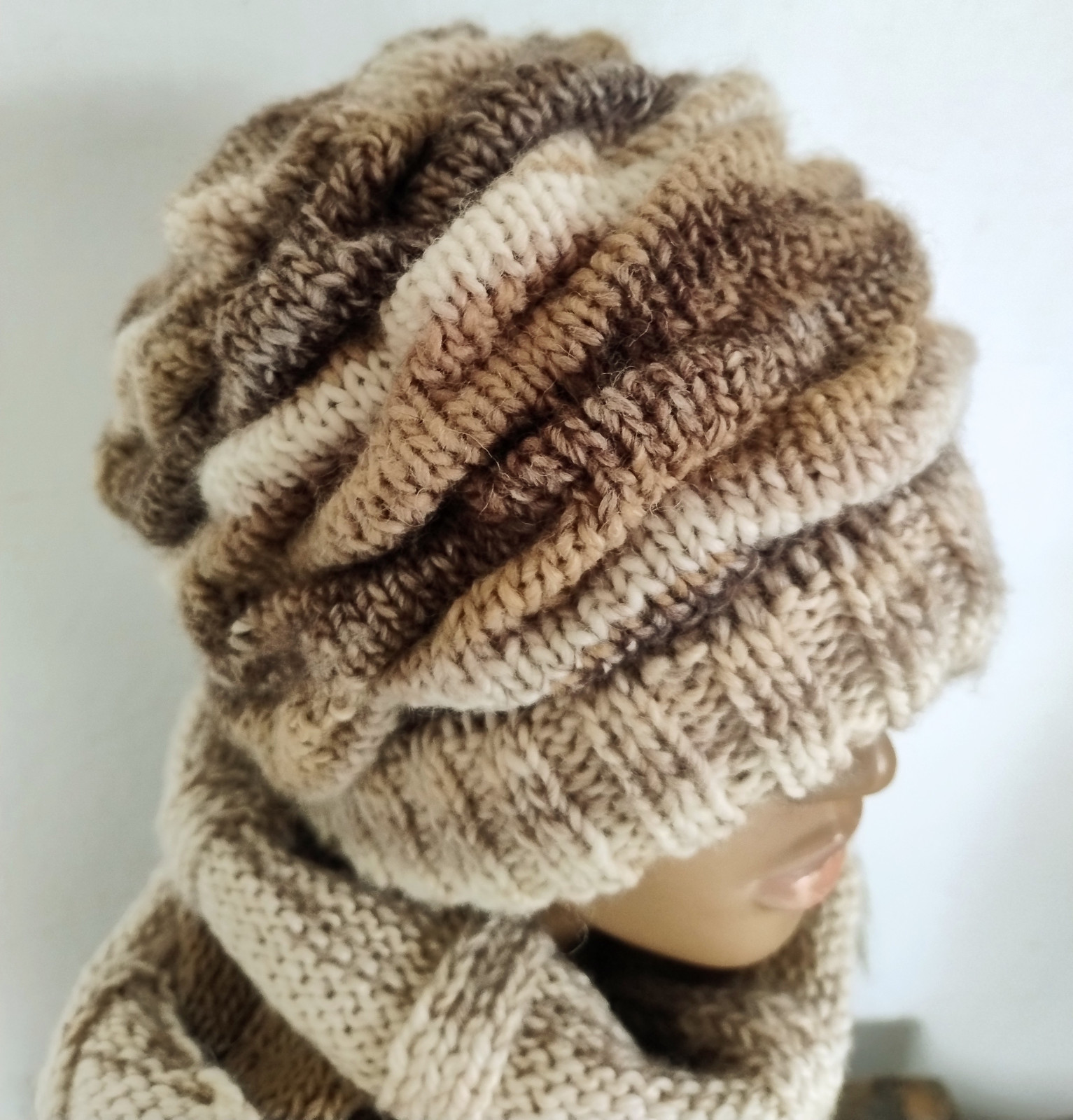 Czapka plus szal-chusta w kolorystyce beży i brązów.Mieszanka wełny i akrylu.Jedyny model.Projekt autorski