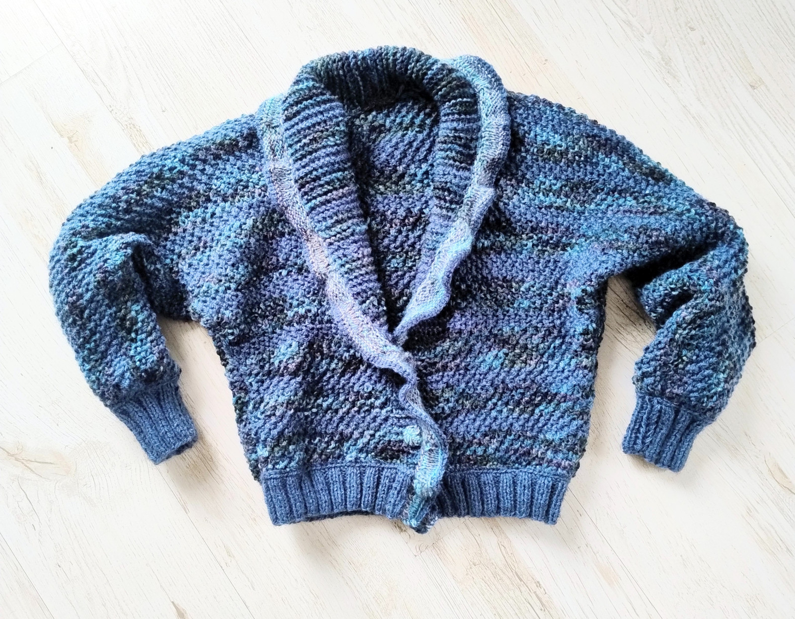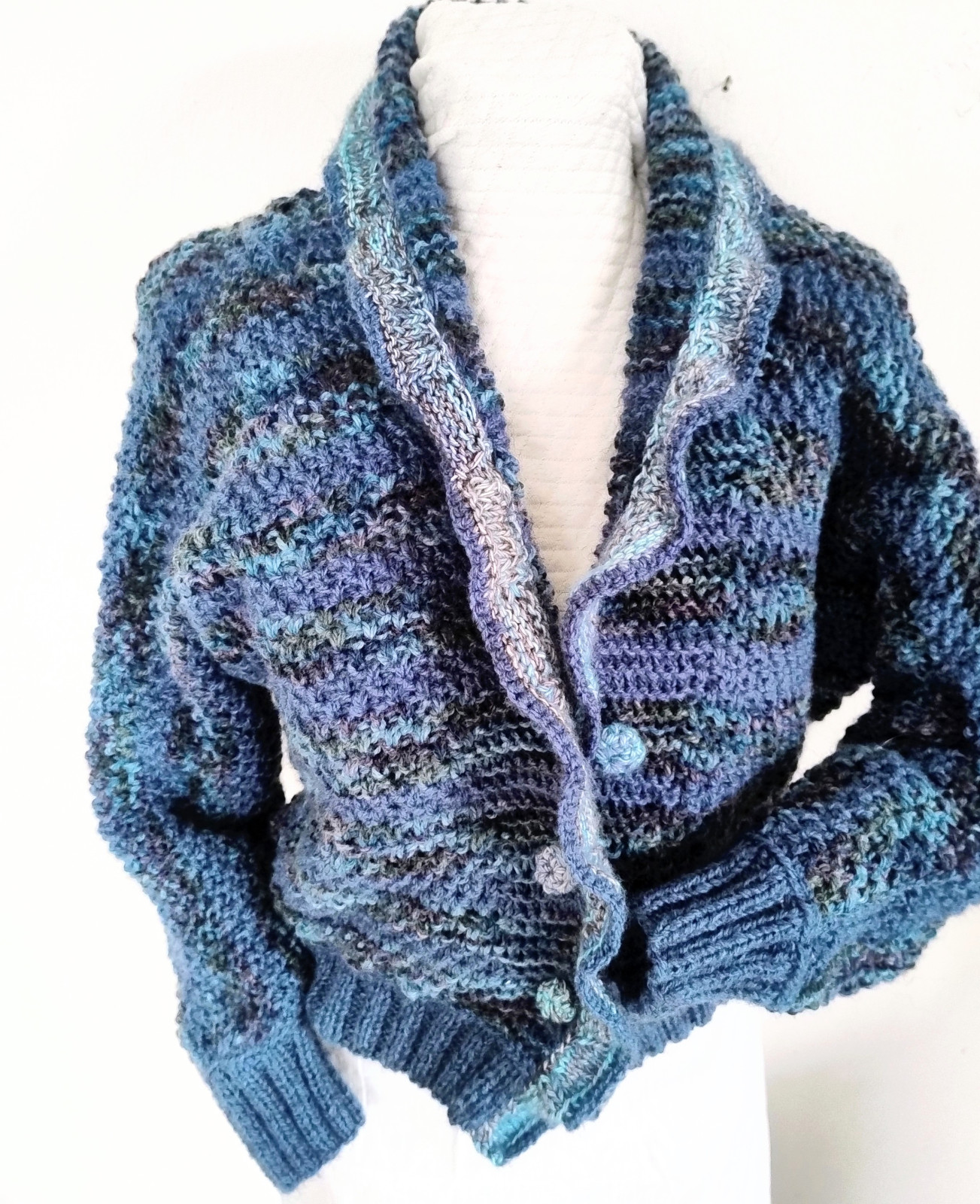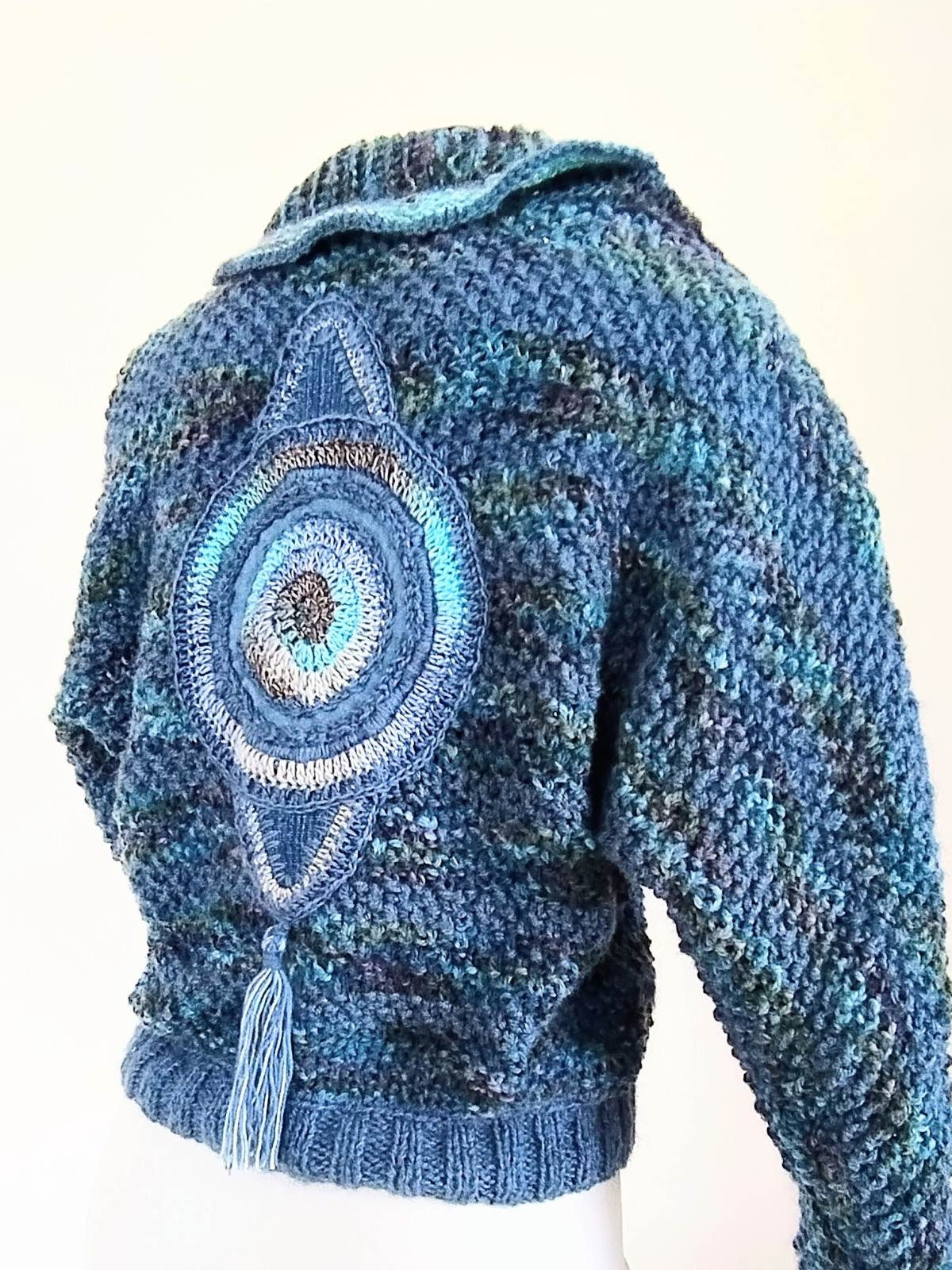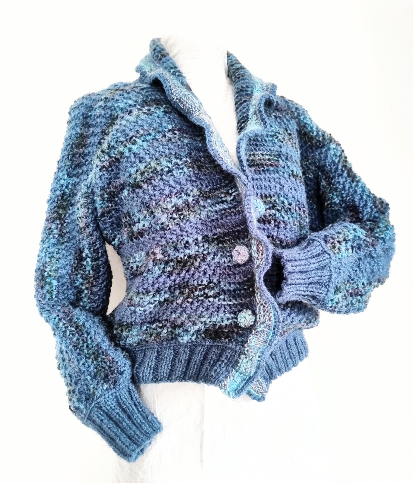 Krótki sweter rozpinany w kolorystyce melanżowej niebieskości. Kolory płynnie przechodzą.Sweter robiony ręcznie na drutach. dekold i przód wykończony delikatną ,, falbanką,, Aplikacja z wełny i jeansu naszyta na tyle swetra.Rozmiar S/ M. Długość