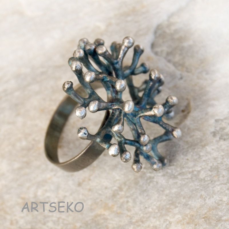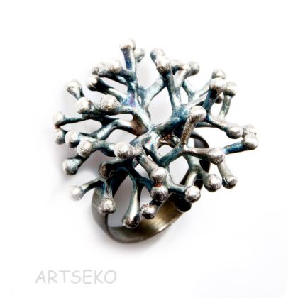 Nowoczesny pierścionek wykonany ręcznie ze srebra próby 925 . Koronę pierścionka stanowi gąszcz gałązek. Srebro satynowane, oksydowane i miejscowo polerowane. Rozmiar jubilerski pierścionka 14,5. Na zamówienie wykonam inne rozmiary.