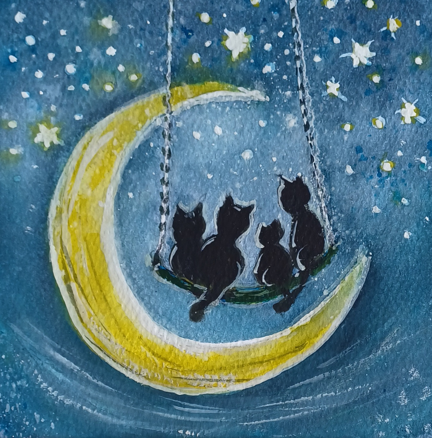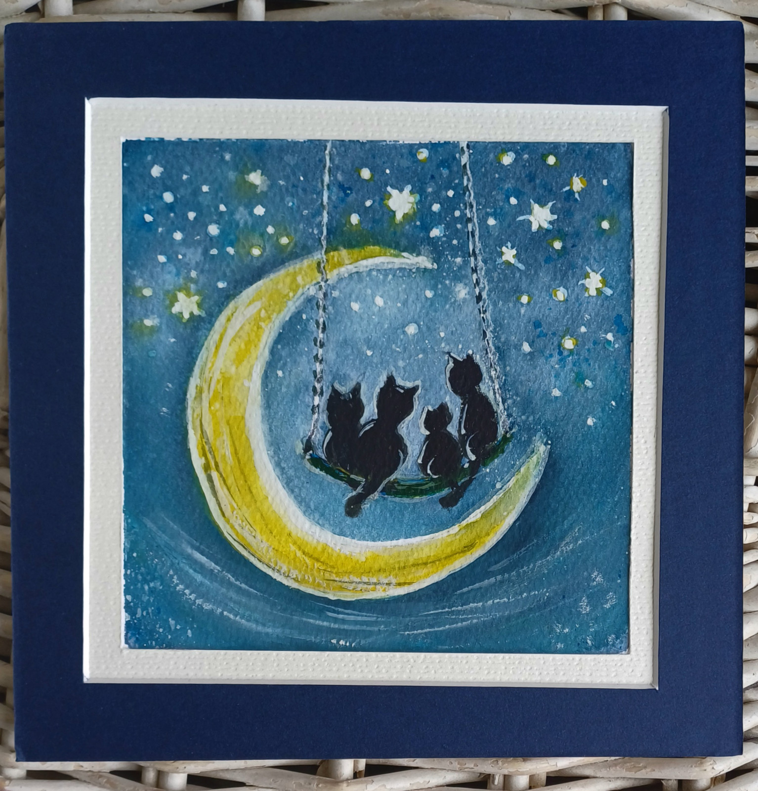 Akwarela,, rodzina kotow huśtajacych się w świetle księżyca. Praca, sygnowana, namalowana na papierze akwarelowym 300gr, 100% bawełna, farby Roman Szmal Rozmiar o sprzedaży w passe-partout, wymiary 19 cm x 19 cm