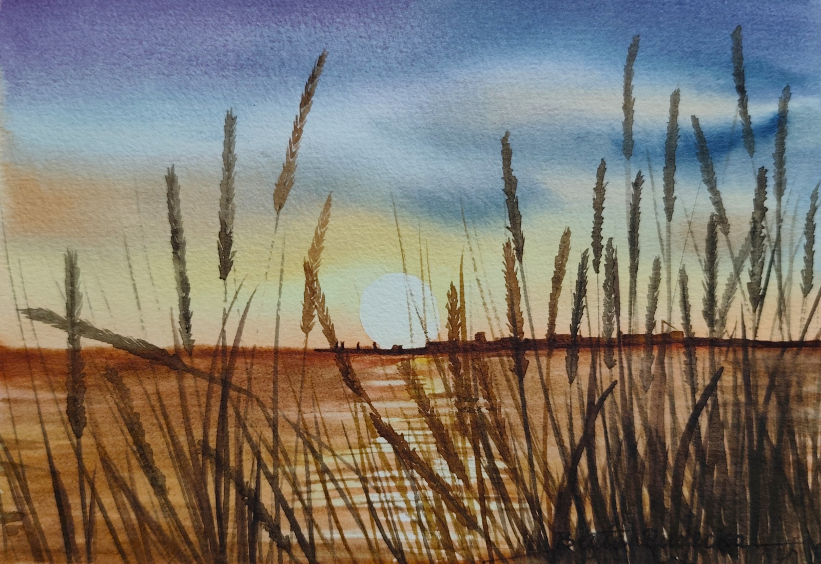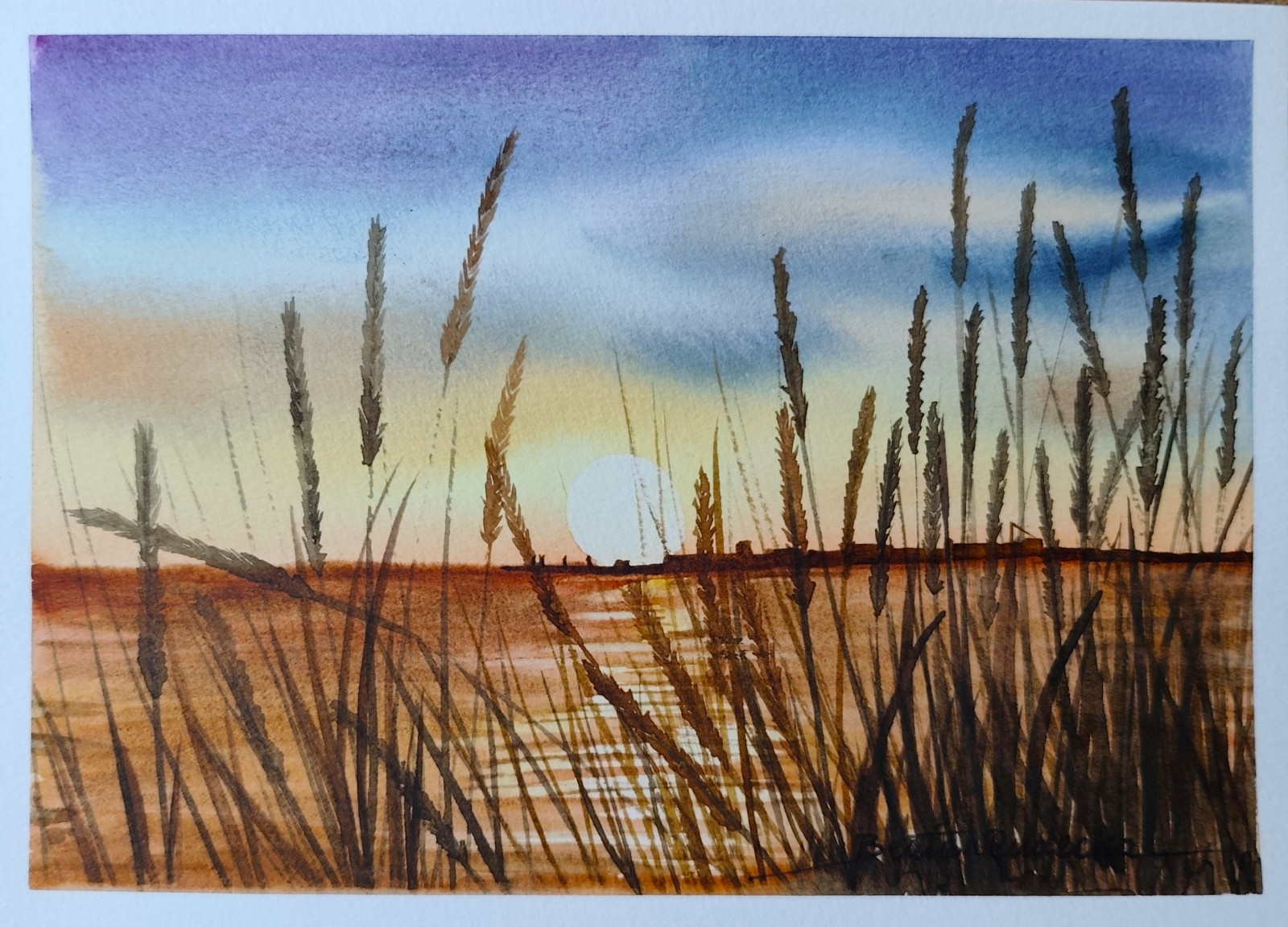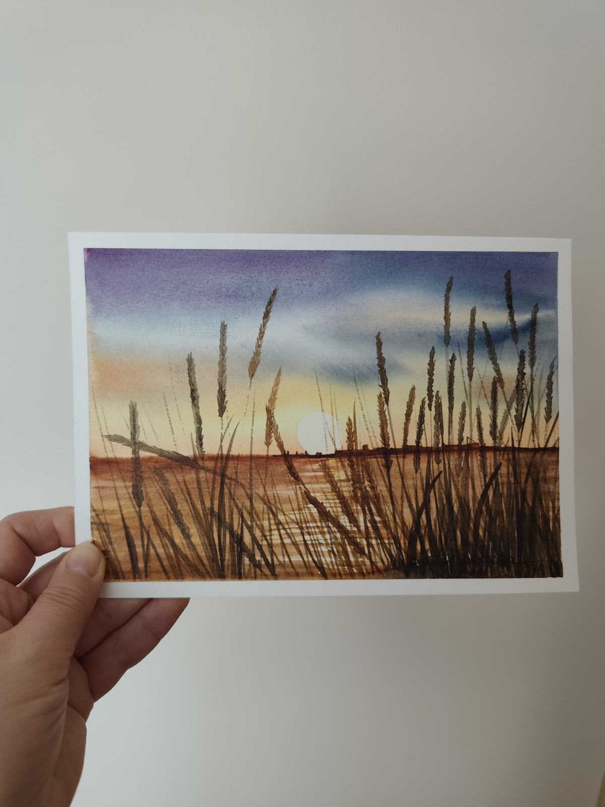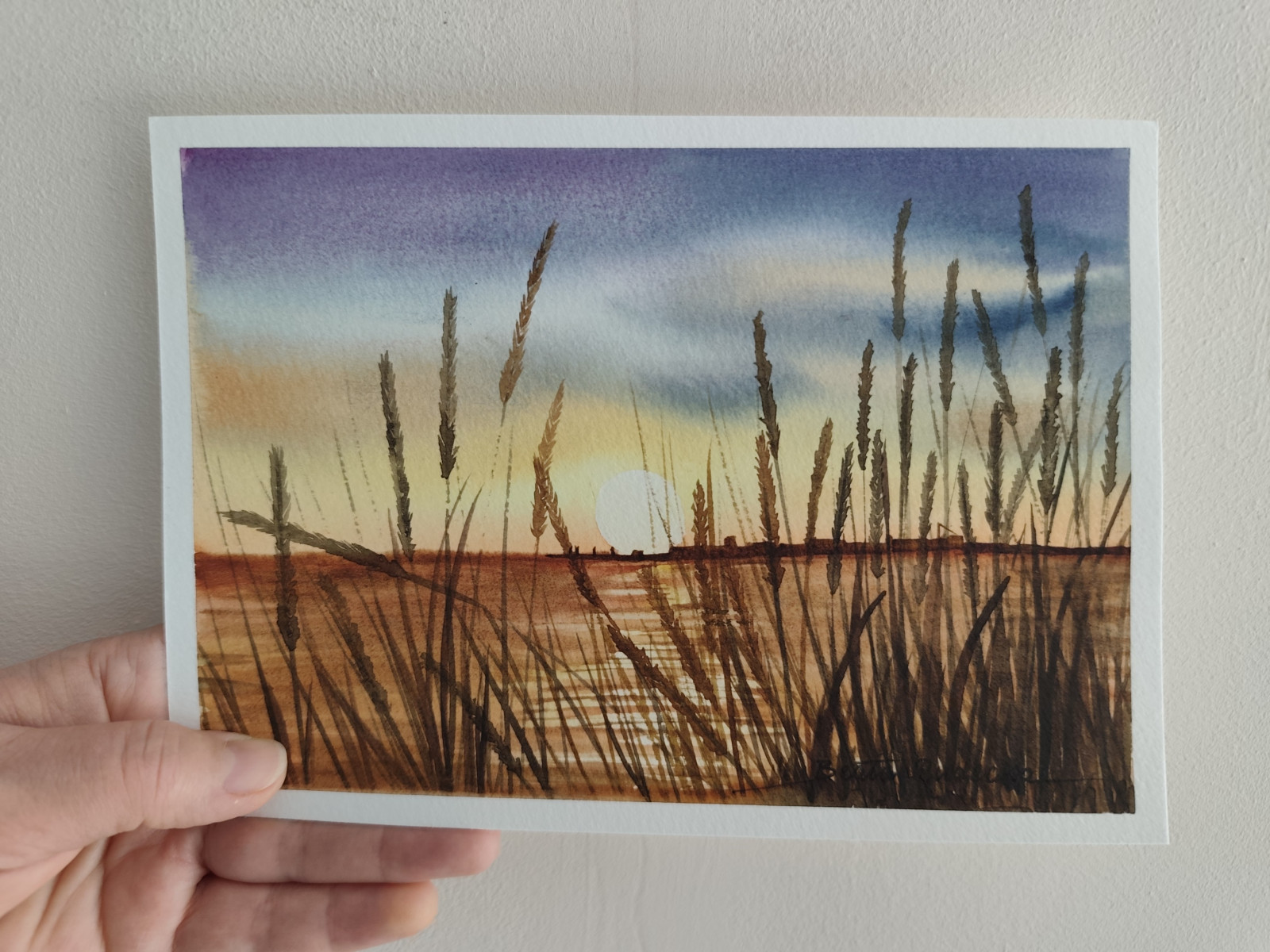 Akwarela wykonana na wysokiej jakości papierze akwarelowym 300g, przy użyciu farb o dużej trwałości i archiwalnej jakości.