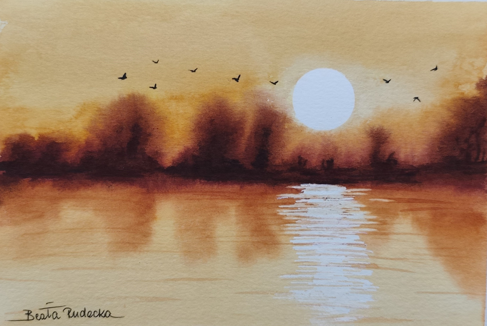Przedstawiam „Słoneczny Przelot” – oryginalną akwarelę, która powstała z tęsknoty za ciepłym, popołudniowym światłem. Dominują tu nasycone brązy i energetyczne pomarańcze, które wprowadzą do Twojego wnętrza spokój i przytulną atmosferę.