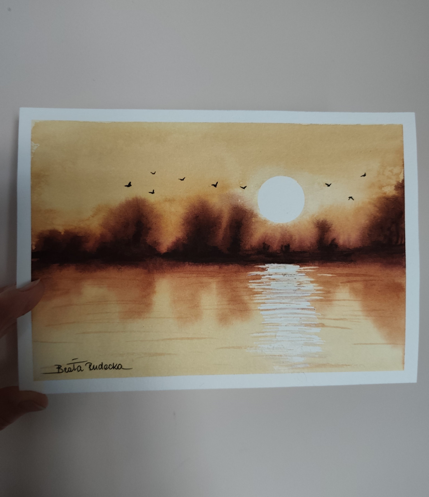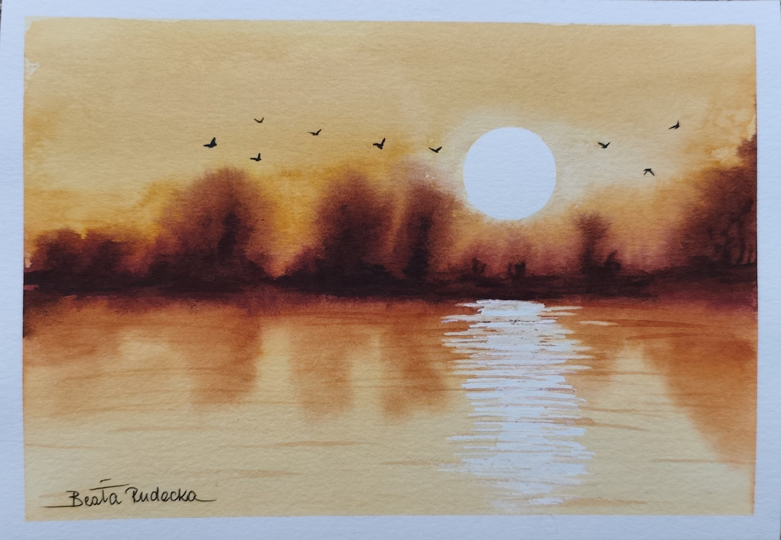 Oryginalna akwarela Słoneczny Przelot 14,7x21 Handmade