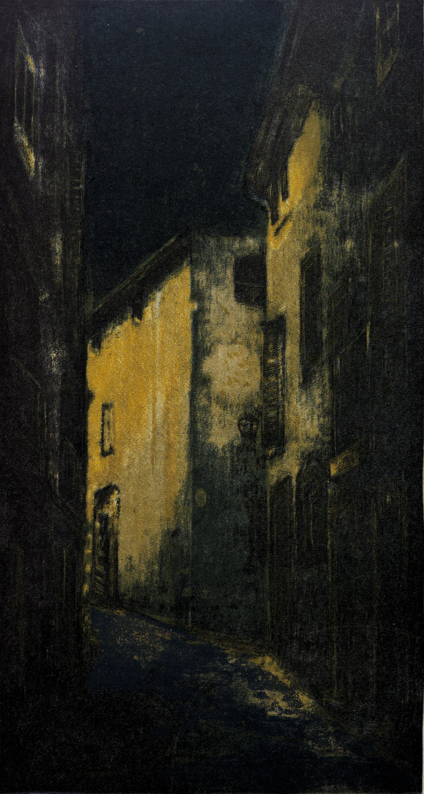 Pejzaż wykonany w technice litografii barwnej, wielomatrycowej.