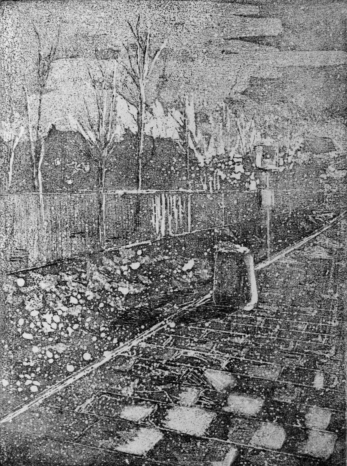 Grafika obrazująca pejzaż urbanistyczny wykonana w technice wklęsłodruku (akwatinta, odprysk, sucha igła)
