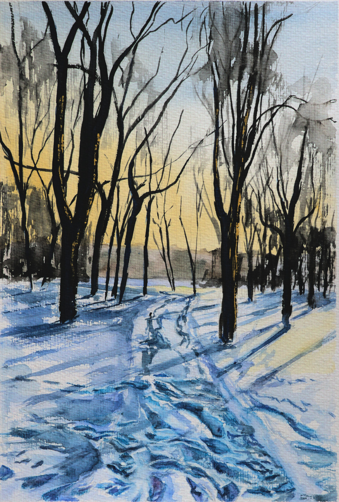 Akwarela przedstawiająca pejzaż zimowy. Malowana na papierze o wysokiej gramaturze - wymiar 21x31 cm
