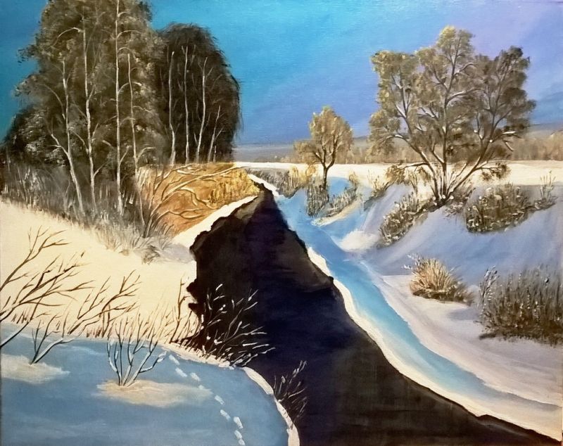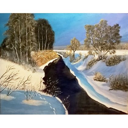 Pejzaż zimowy. Obraz namalowany w technice akrylowej na profesjonalnym, fabrycznym płótnie o wymiarach 50/40 cm. Obraz posiada pomalowane boki. Nadaje się od razu do powieszenia na ścianie. Obraz jest werniksowany, sygnowany z tyłu płótna - sprzedawany bez oprawy. Zapraszam.