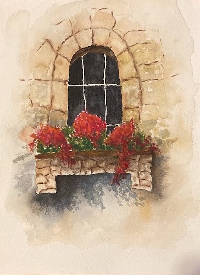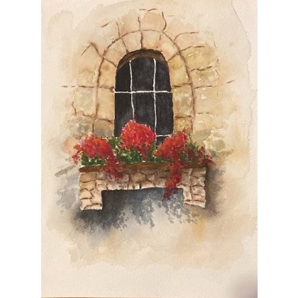 Na tym malowniczym obrazie akwarelowym ukazuje się kawałek kamienistej fasady budynku. Wszystkie detale są zobrazowane z delikatnością, charakterystyczną dla techniki akwareli, nadając obrazowi subtelnego uroku.