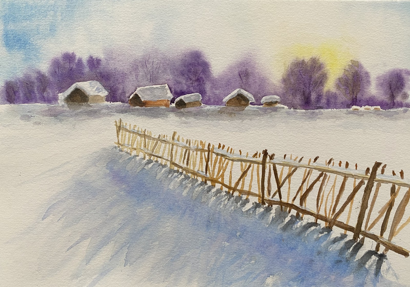 Odkryj urok zimowego spokoju dzięki tej wyjątkowej akwareli! Ten uroczy obraz przedstawia malowniczy krajobraz zimowy, gdzie delikatne płatki śniegu opadają na malowniczą scenerię. Drzewa ubrane są w białe szaty, a cała przestrzeń emanuje spokojem i magią zimy.