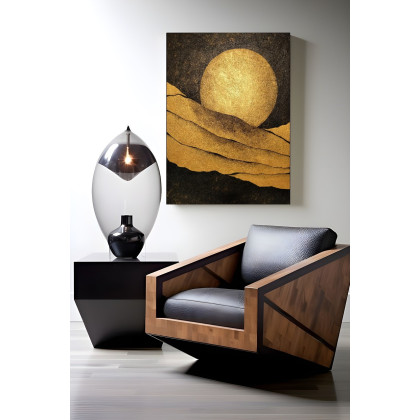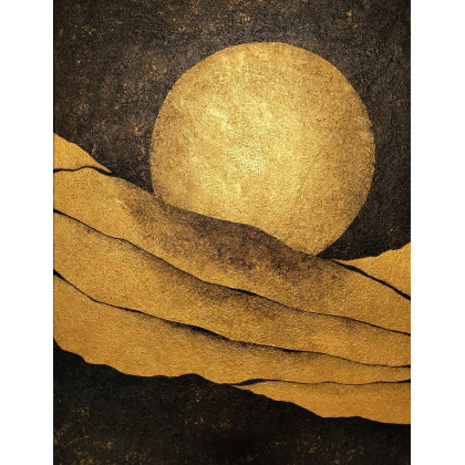 Złota Abstrakcja, akryl na płótnie o wymiarach 60 x 80. Kontrast między złotymi elementami, a czarnym tłem tego obrazu ukazuje minimalistyczną estetykę, prostotę, a jednocześnie głębię abstrakcyjnego przekazu… Te kolory i abstrakcyjna forma obrazu nadadzą każdemu pomieszczeniu eleganckiego charakteru.