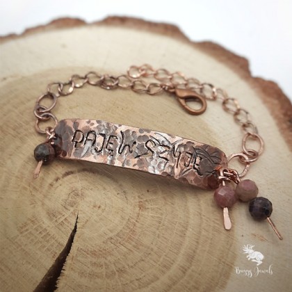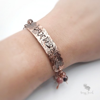 Do bransoletki zostały doczepione koraliki z naturalnego rodonitu oraz łańcuszek do regulacji. Długość bransoletki 16-20 cm.