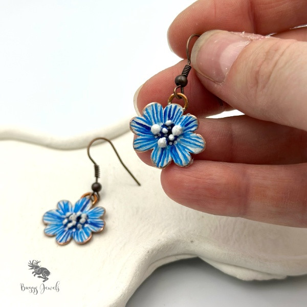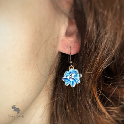 Malutkie błękitne kolczyki kwiatki, wykonane ręcznie począwszy od rozrysowania projektu poprzez wycinanie delikatną piłeczką włosową, lutowaniu kuleczek, które również wcześniej zostały stopione z miedzianego drutu oraz malowaniu .