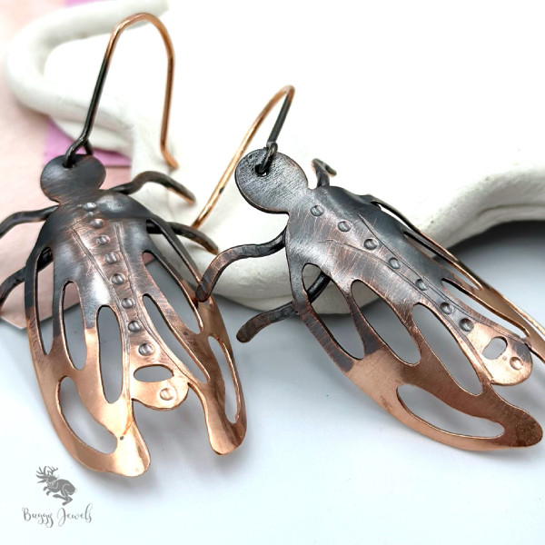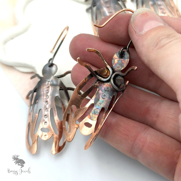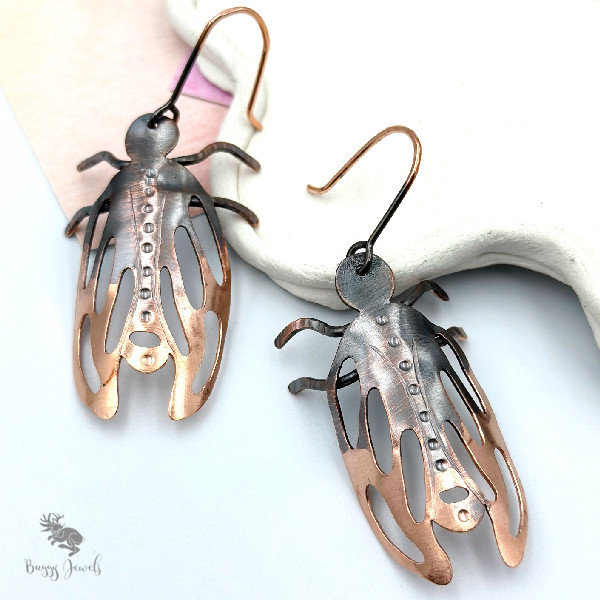 Ręcznie wykonane kolczyki z miedzi w formie stylizowanych owadów, tworzone z dbałością o każdy detal. Elementy zostały precyzyjnie wycinane i formowane, a następnie lutowane, co nadaje im trwałość i rzeźbiarski charakter. Subtelne czernienie powierzchni podkreśla strukturę metalu i tworzy piękny kontrast z naturalnym połyskiem miedzi.