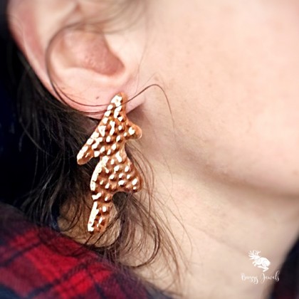 Dwa zupełnie różne kolczyki tworzące jedną parę. W złocistej miedzi uchwyciłam motyw koralowców i zapowiedź zbliżającego się lata. Kolczyki zostały ręcznie wykonane techniką repusowania na zimno. Z tyłu przylutowane zostały srebrne sztyfty.