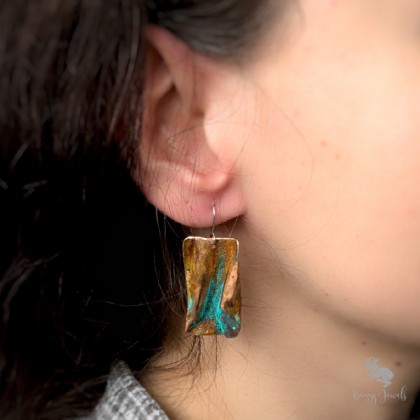 Miedziane kolczyki, fakturowane i patynowane zieloną i rdzawą patyną. Wykonane z miedzi, zapięcia typu rybki, wykonane ze stali chirurgicznej, zabezpieczone silikonową zatyczką. Kolczyki zostały ręcznie uformowane w lekko falisty kształt i pokryte patyną o ładnym turkusowo- lazurowym kolorze. Kolczyki zostały dodatkowo zabezpieczone specjalnym, bezbarwnym, akrylowym lakierem.