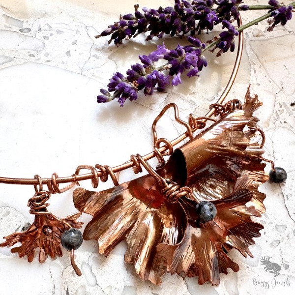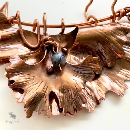 Wykonany z miedzi uformowanej w kształt liści miłorzębu, które są delikatnie fakturowane i czernione. Wraz z pozostałymi elementami wykonanymi z miedzianego drutu oraz koralików z naturalnym labradorytem, umocowane są na delikatnej miedzianej kolii. Kolia posiada miedziany łańcuszek oraz zapięcie, dzięki czemu naszyjnik można swobodnie regulować.