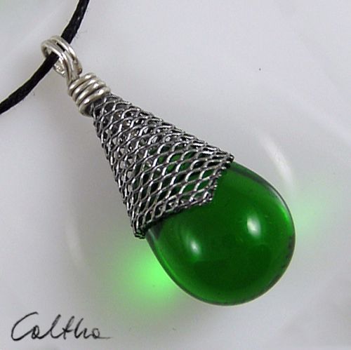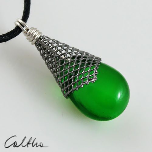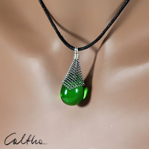 Duża szklana kropla Jablonex w oprawie z ręcznie formowanej metalowej siateczki. Wielkość ok 3,5 cm. Woskowany sznurek do zawieszenia. Dostępny w różnych kolorach, Znajdź lub zamów kolczyki lub klipsy do kompletu.