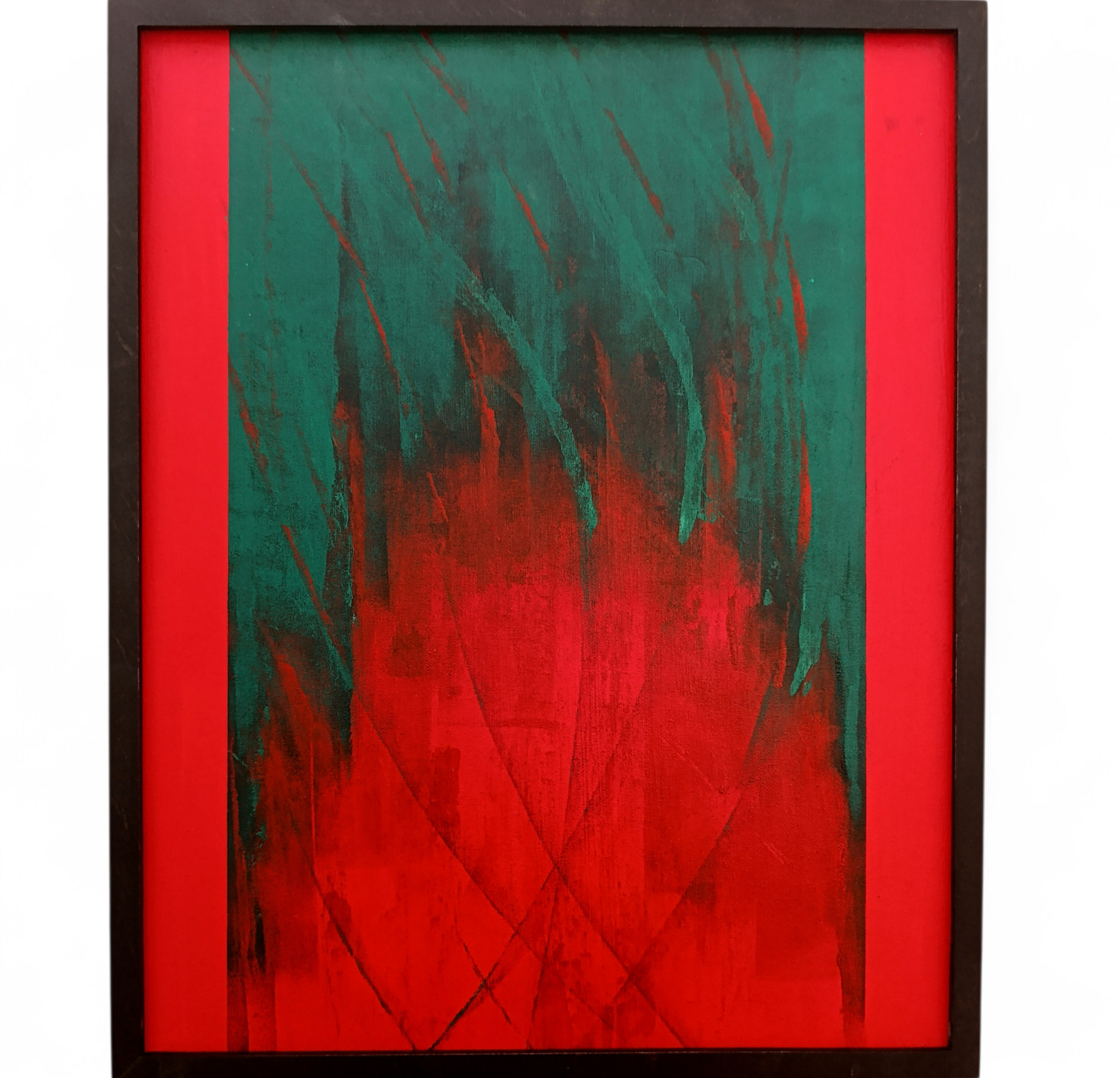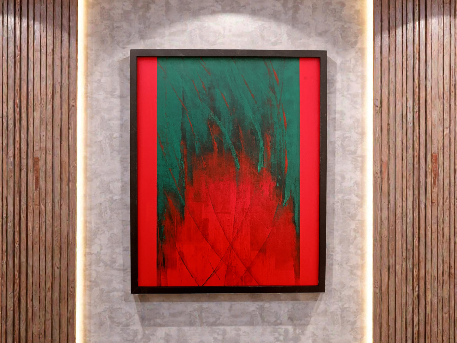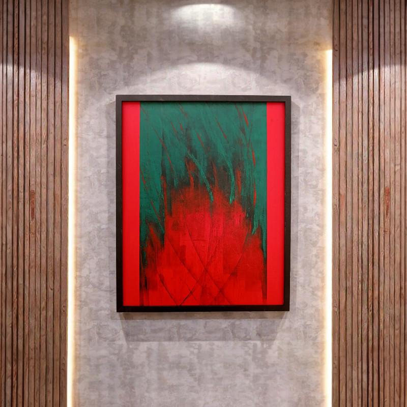 Oryginalny obraz malowany farbami akrylowymi na płótnie. Dzieło charakteryzuje się bogatą teksturą i pionową kompozycją, która optycznie podwyższa pomieszczenie. Technika: Akryl na płótnie. Kolorystyka: Dominująca krwista czerwień, ciemna zieleń, akcenty czerni. Styl: Abstrakcja ekspresyjna / Modern Art. Oprawa: Obraz oprawiony w elegancką, minimalistyczną czarną ramę, która podkreśla głębię kolorów. Gotowy do zawieszenia. Obraz doskonale odnajdzie się w surowych, loftowych wnętrzach, jak i nowoczesnych salonach wymagających mocnego akcentu kolorystycznego.