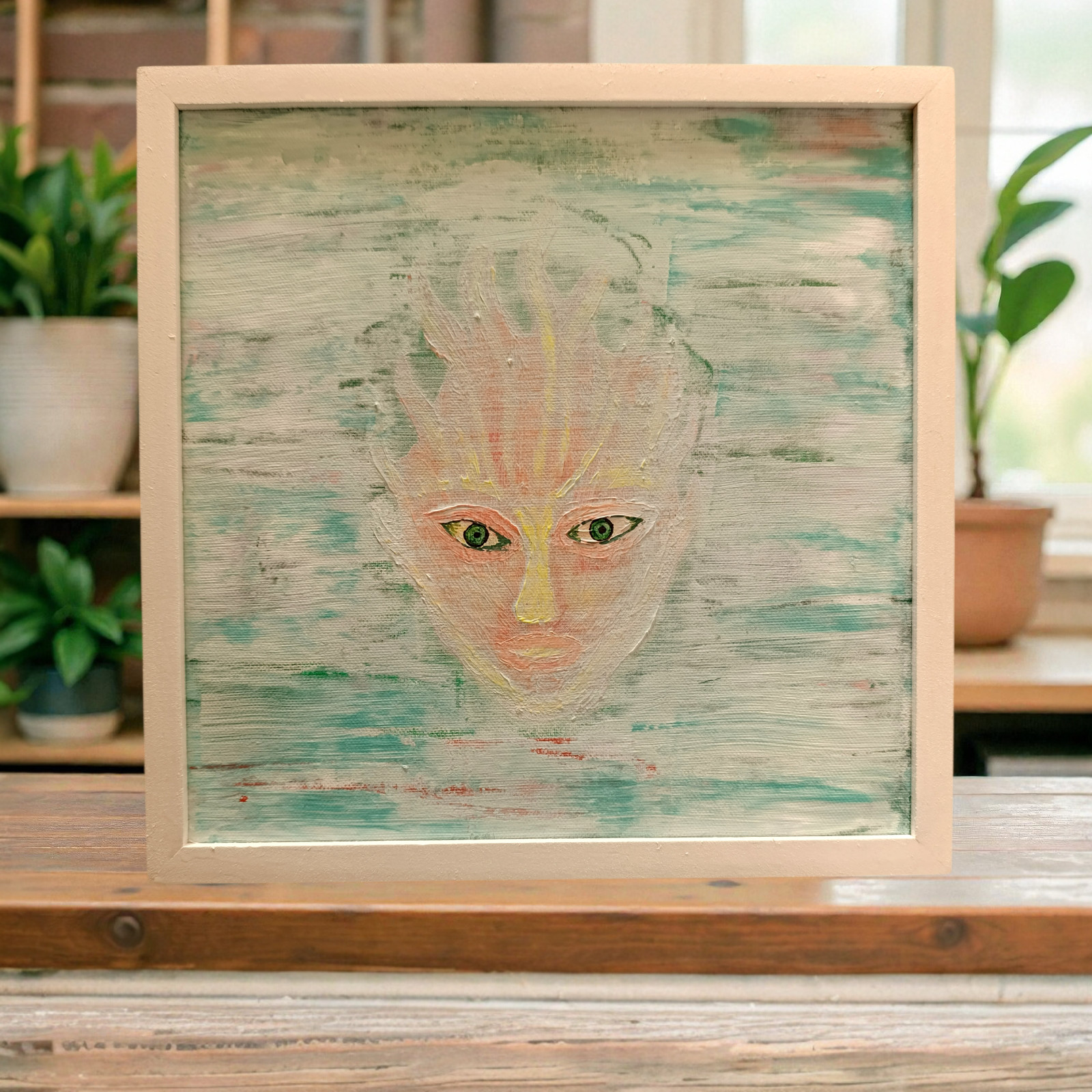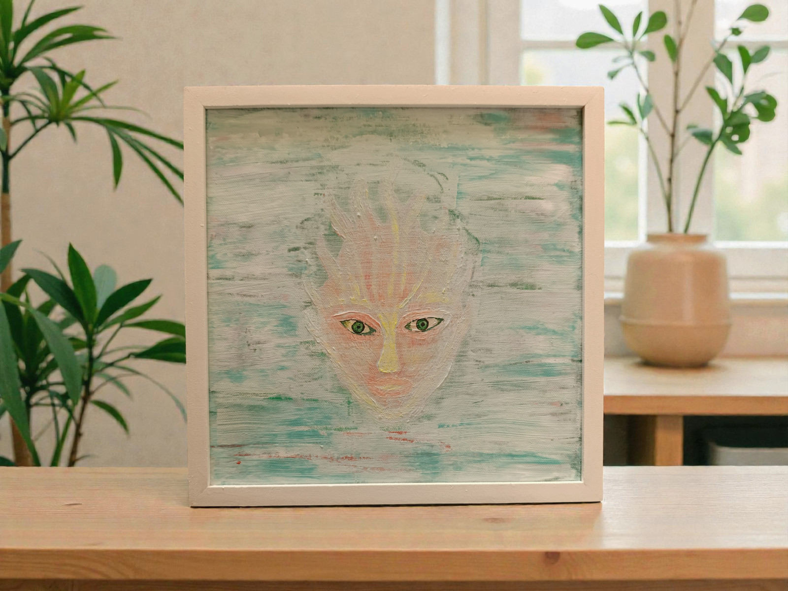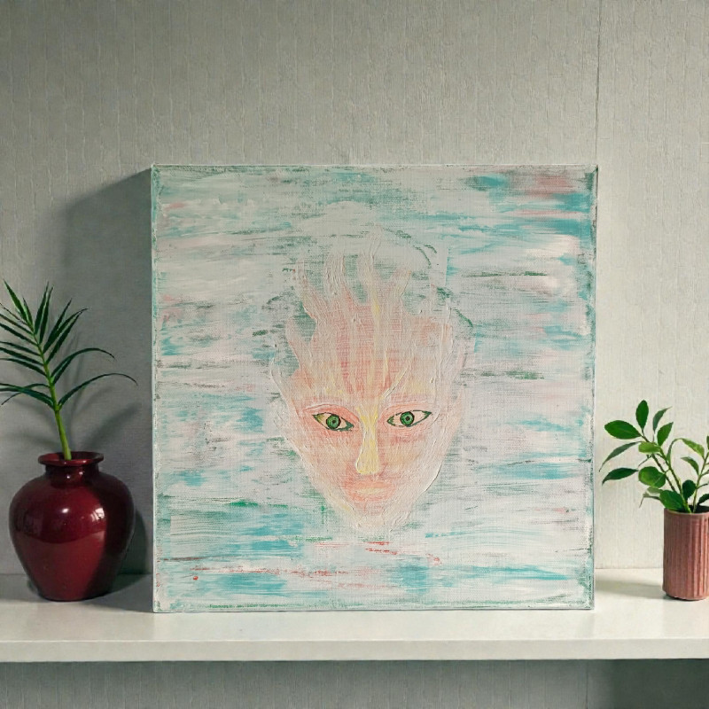 Przedstawiamy intrygujący obraz wykonany w technice akrylowej na płótnie, który łączy w sobie elementy abstrakcji z subtelną figuratywnością. Centralnym punktem kompozycji jest niemal transparentna, świetlista twarz, która zdaje się wyłaniać z mglistego, błękitno-białego tła lub w nim rozpuszczać.Najbardziej przyciągającym wzrok elementem są intensywnie zielone oczy, które nadają postaci głębi i niemal hipnotycznego charakteru. Ich wyrazistość kontrastuje z delikatną, pastelową kolorystyką reszty płótna.Detale i TechnikaKolorystyka: Dominują chłodne odcienie błękitu, bieli i mięty, przełamane ciepłymi akcentami bladoróżowego i żółci w obrębie twarzy. Styl: Modern abstract / Surrealizm eteryczny. Obraz idealnie wpisuje się w nowoczesne wnętrza typu loft, skandynawskie lub minimalistyczne, wprowadzając do nich spokój i nutę tajemnicy.
