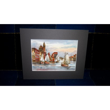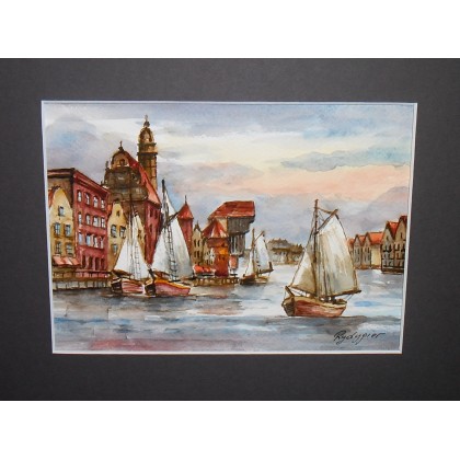 Dawny Gdańsk - obraz akwarelowy na papierze,21 x 15 cm, 30 x 24 cm z passe-partout, bez ramy