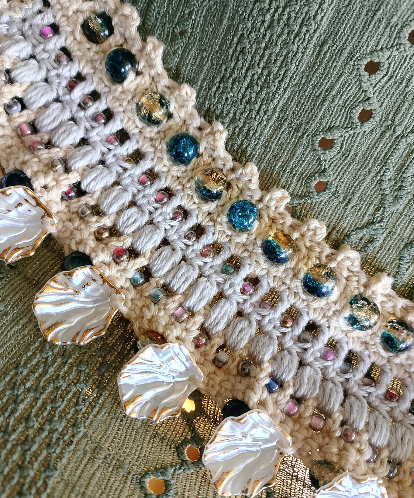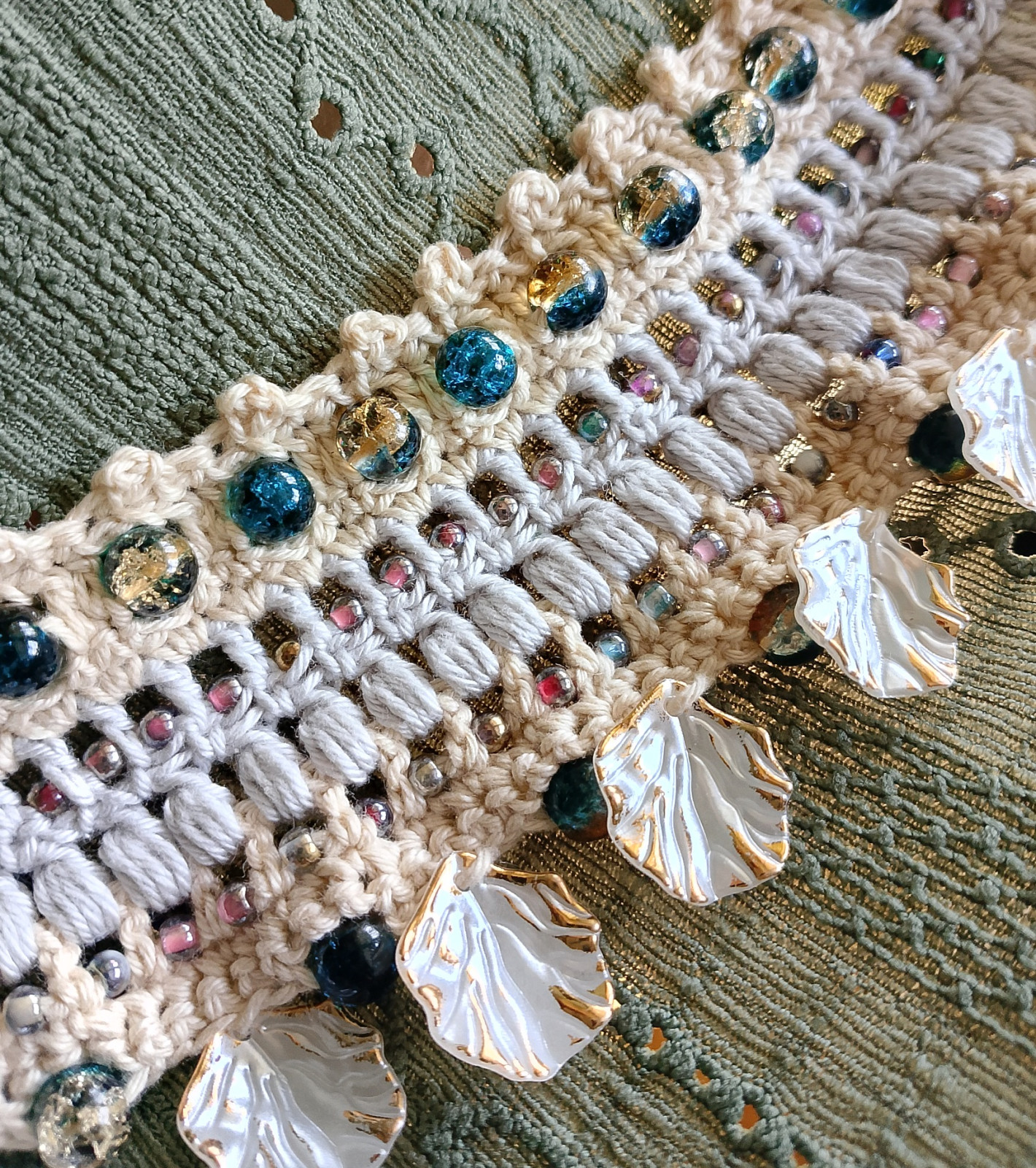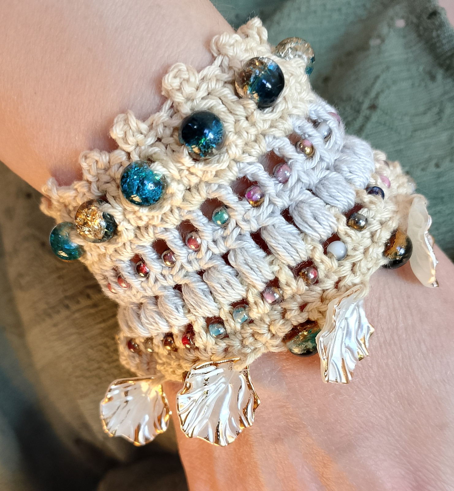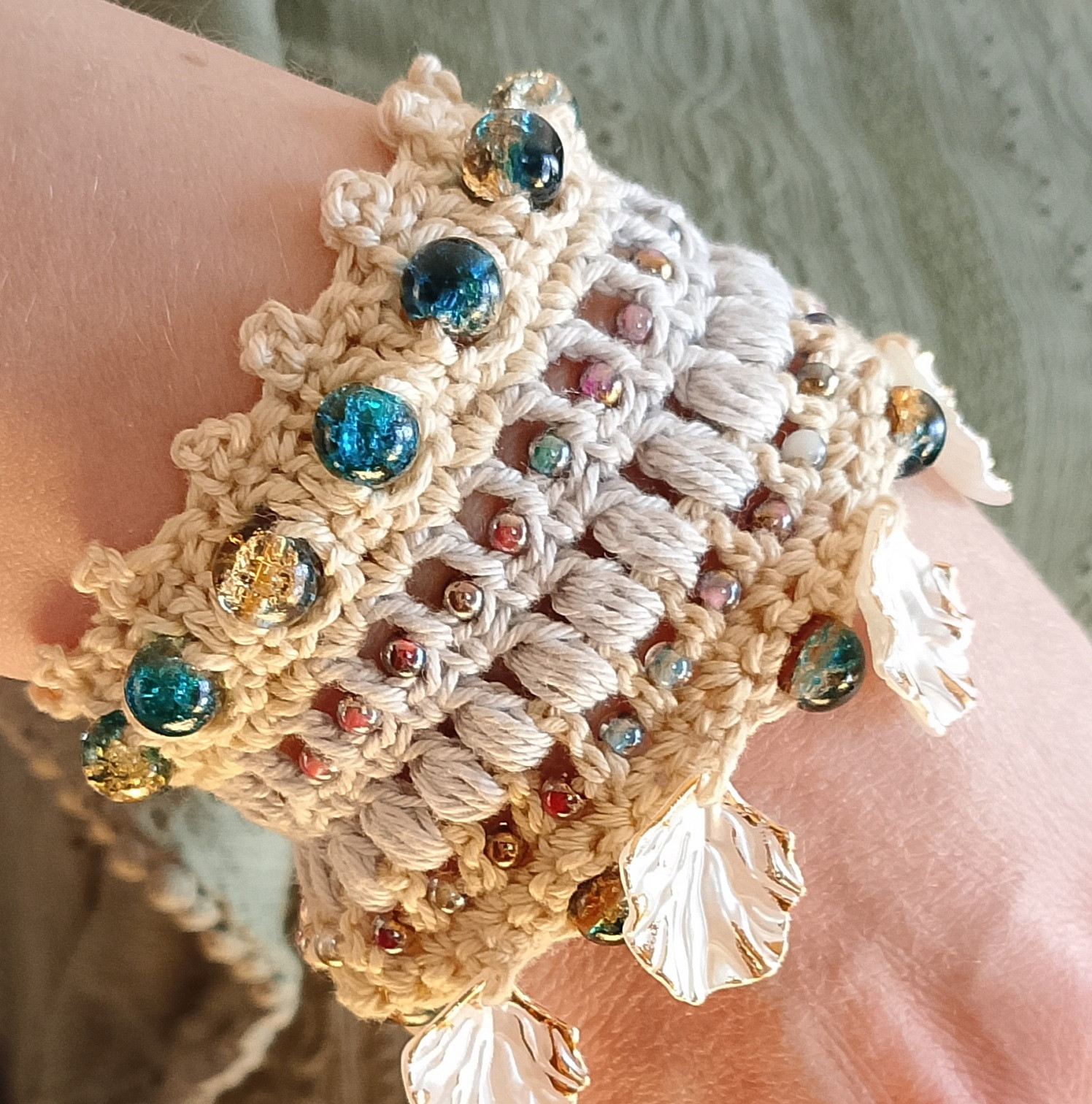 Bransoletka wykonana koronkowym wzorem, ozdobiona koralikami. Jest bardzo delikatna i przyjazna dla skóry, ponieważ została wykonana z bawełny 100%. Nie uczula. Łatwa do samodzielnego zapięcia.