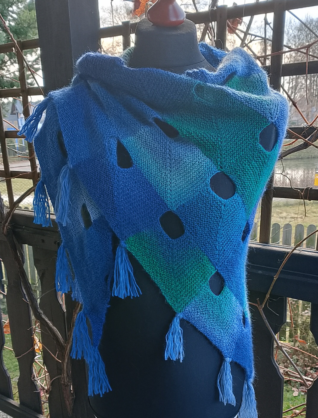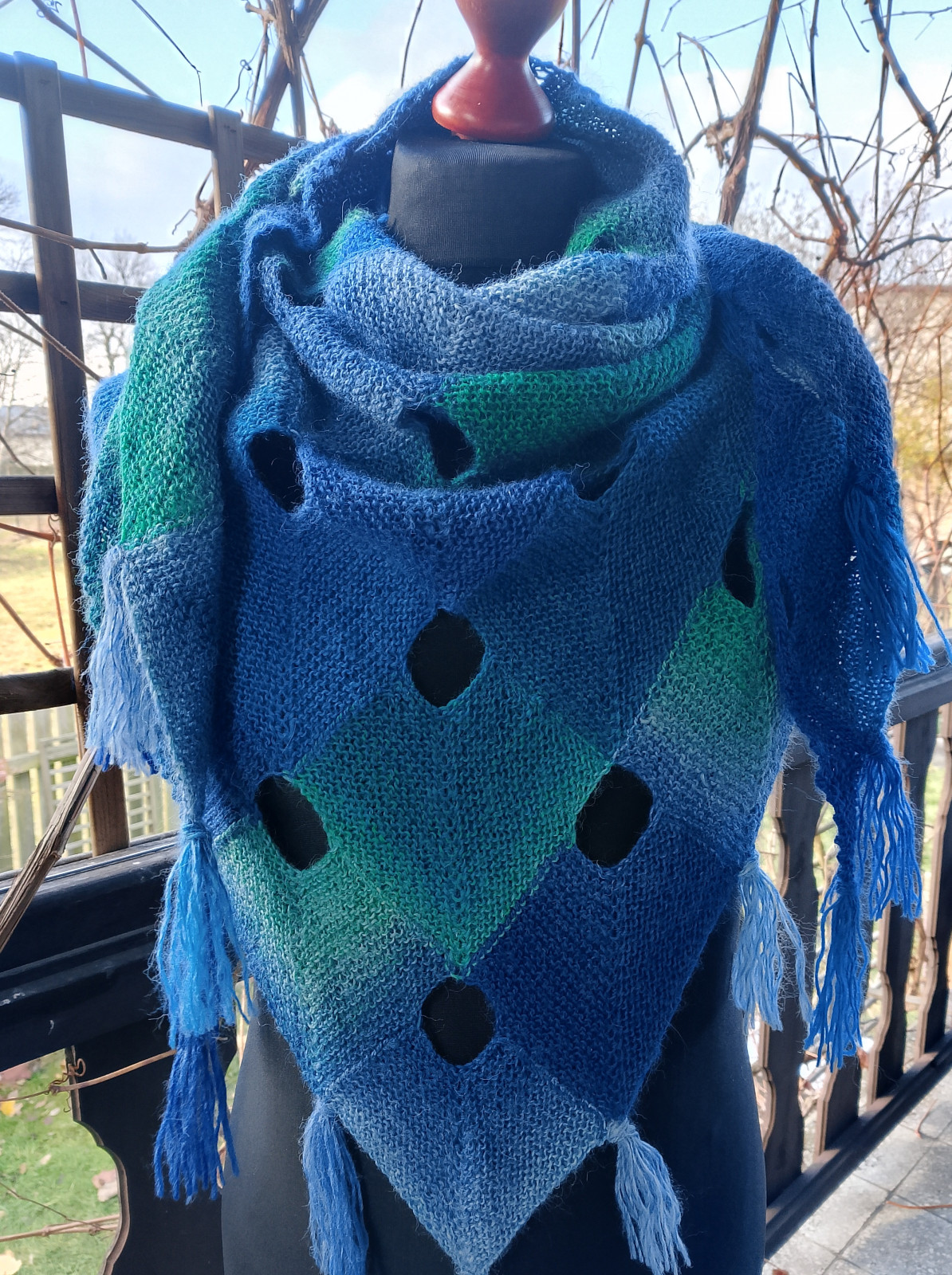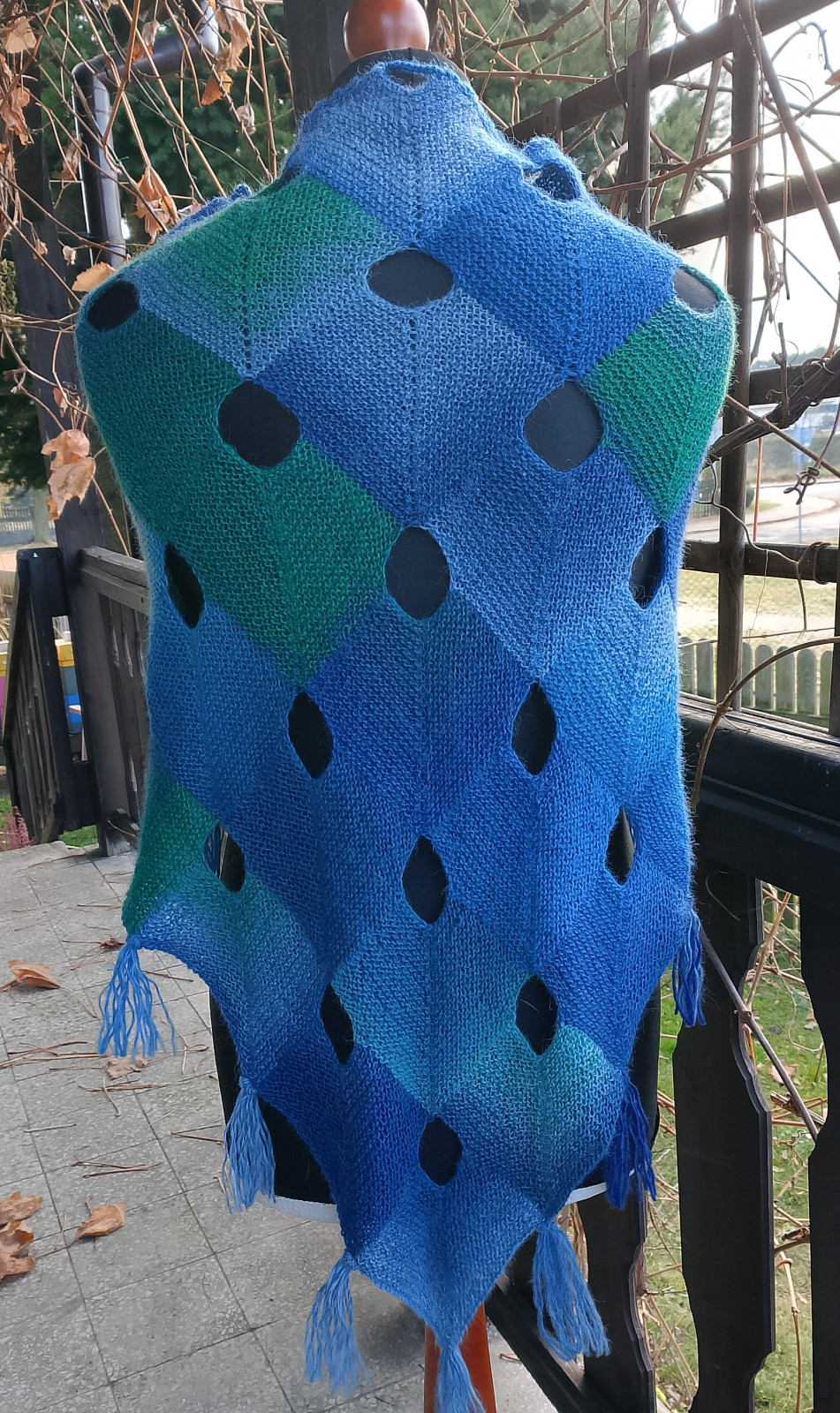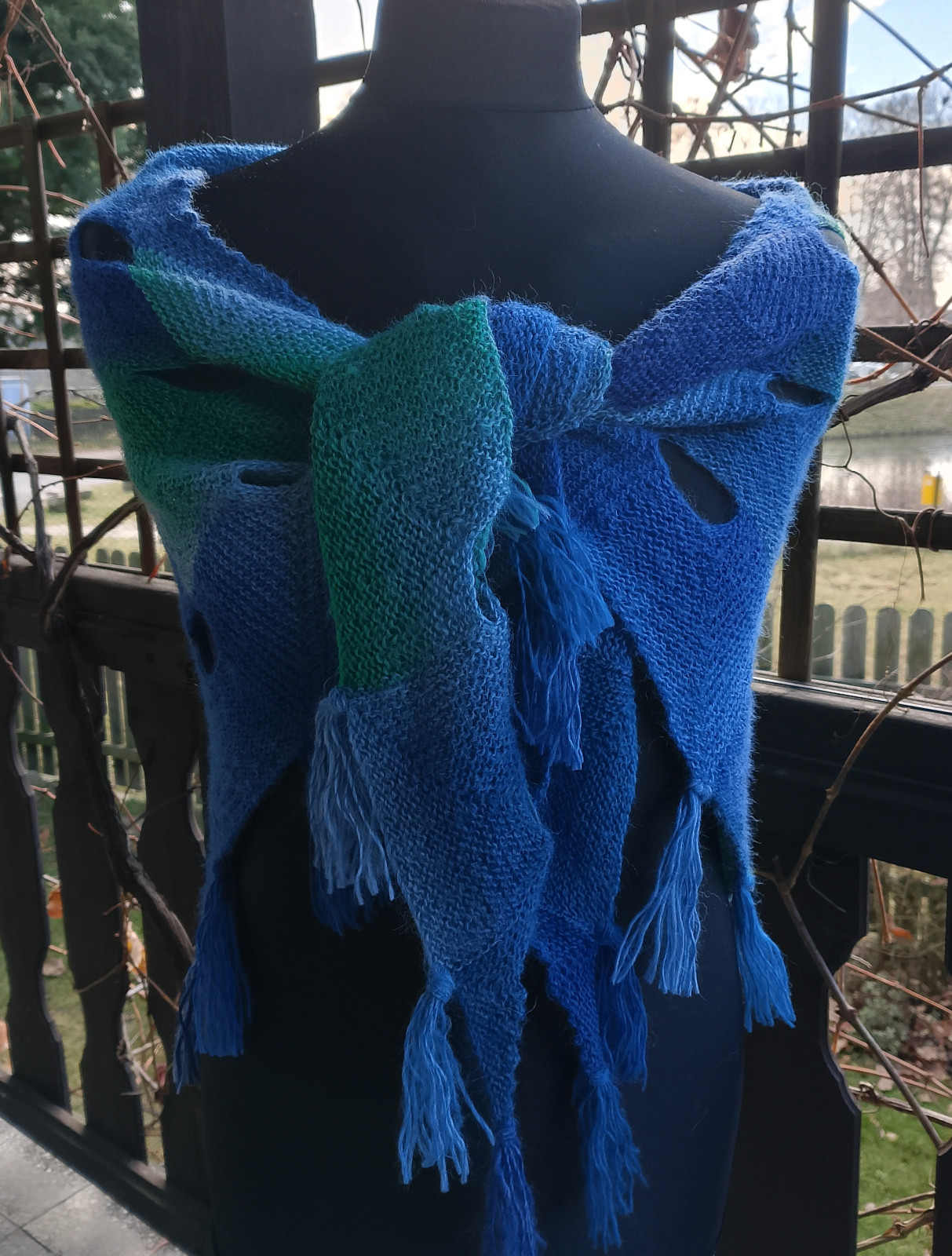 Przepiękna chusta w całości wykonana ręcznie na cienkich drutach gęstym ściegiem. Użyto ciepłej włóczki wełniano-moherowo-akrylowej w cieniowanych kolorach niebiesko turkusowo zielonych. Zastosowano niezwykle dekoracyjny wzór, dodatkowo chusta zakończona jest ozdobnymi frędzlami. Może stać się wyjątkowym prezentem dla wyjątkowej osoby.