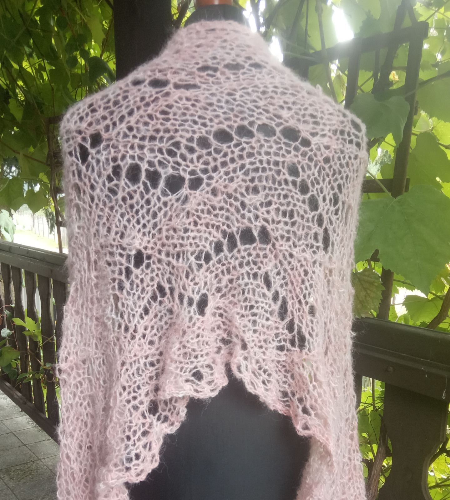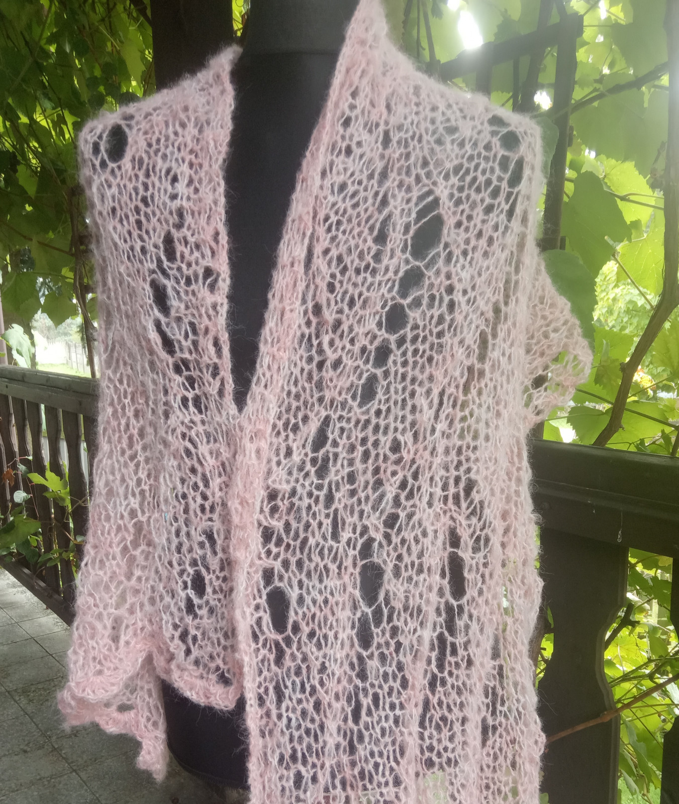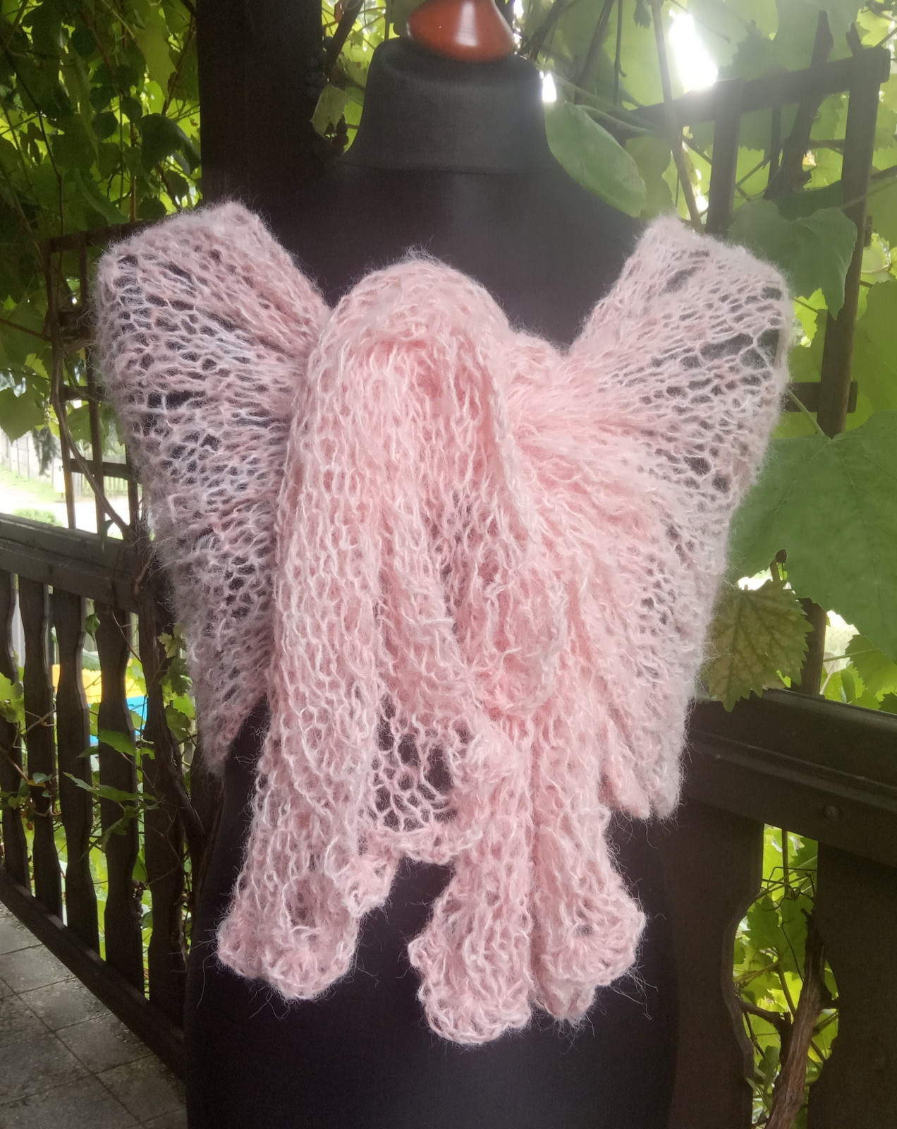 Różowy elegancki szal w całości wykonany ręcznie na drutach pięknym wzorem. Jest bardzo delikatny, leciutki i puszysty. Będzie doskonałym dodatkiem ślubnym, wieczorowym lub codziennym. Ozdobi każdą stylizację. Jest plastyczny i rozciągliwy, więc można nosić go na różne sposoby.
