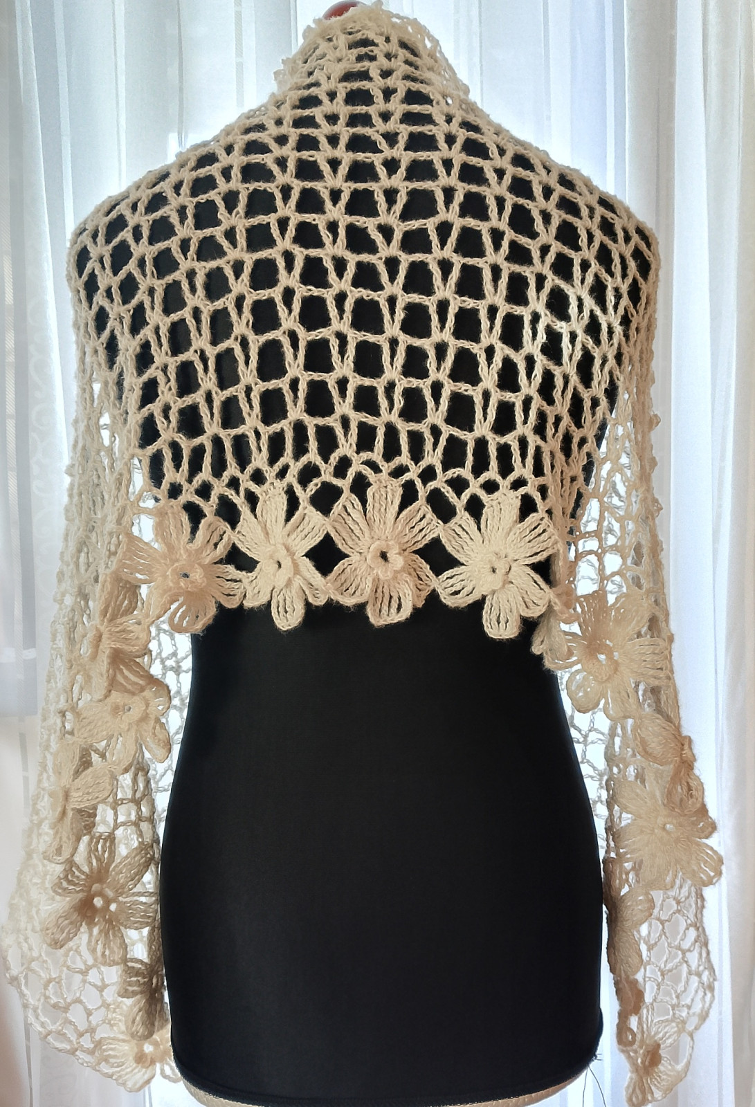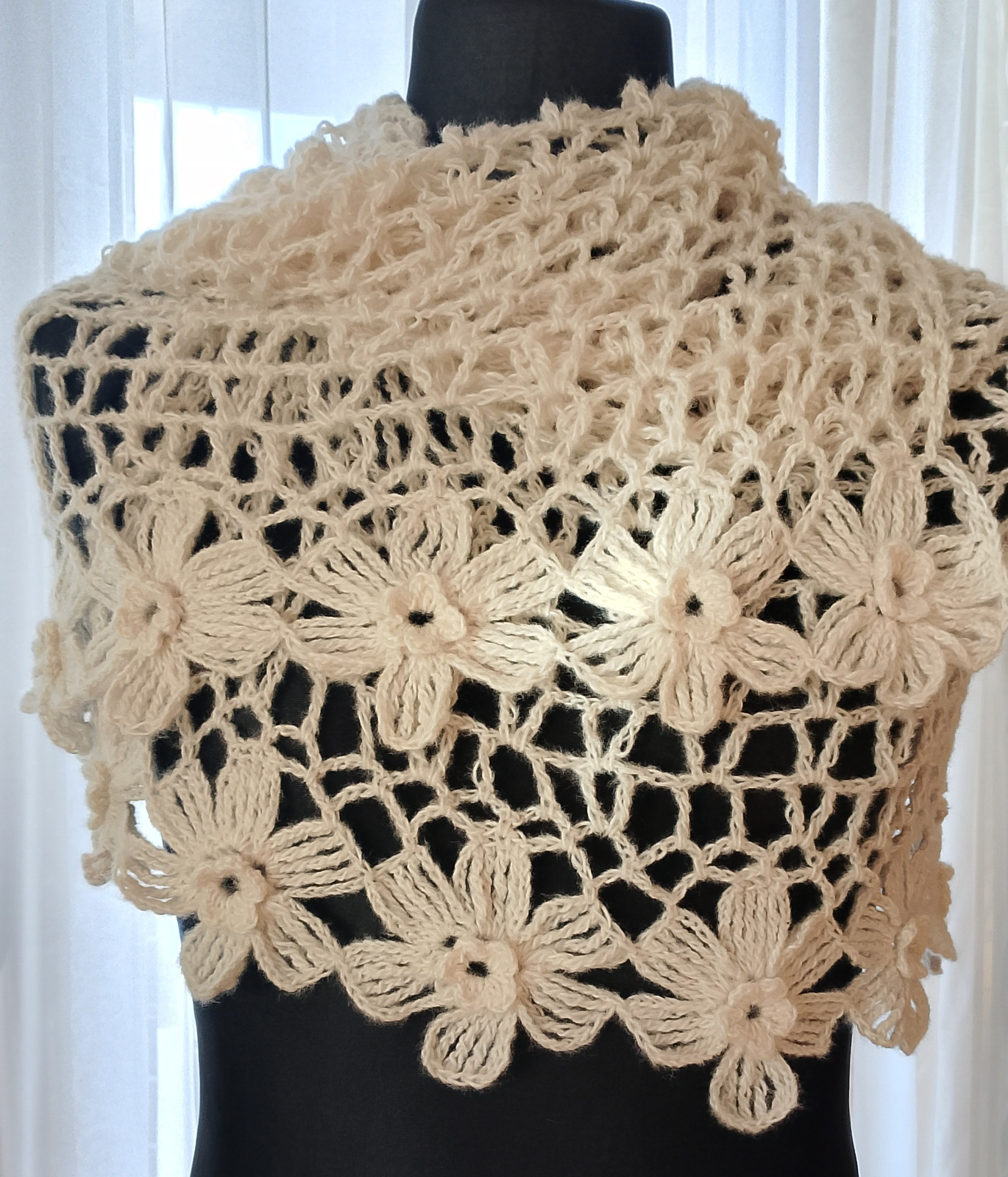 Wyjątkowo piękny szal wykonany w całości ręcznie. Użyto moheru, bardzo delikatnego w dotyku. Szal jest leciutki i ulotny jak mgiełka, a przy tym ciepły. Jest także plastyczny, dzięki czemu można kształtować go na wiele sposobów. Doda uroku każdej stylizacji, zarówno codziennej, jak i wieczorowej.