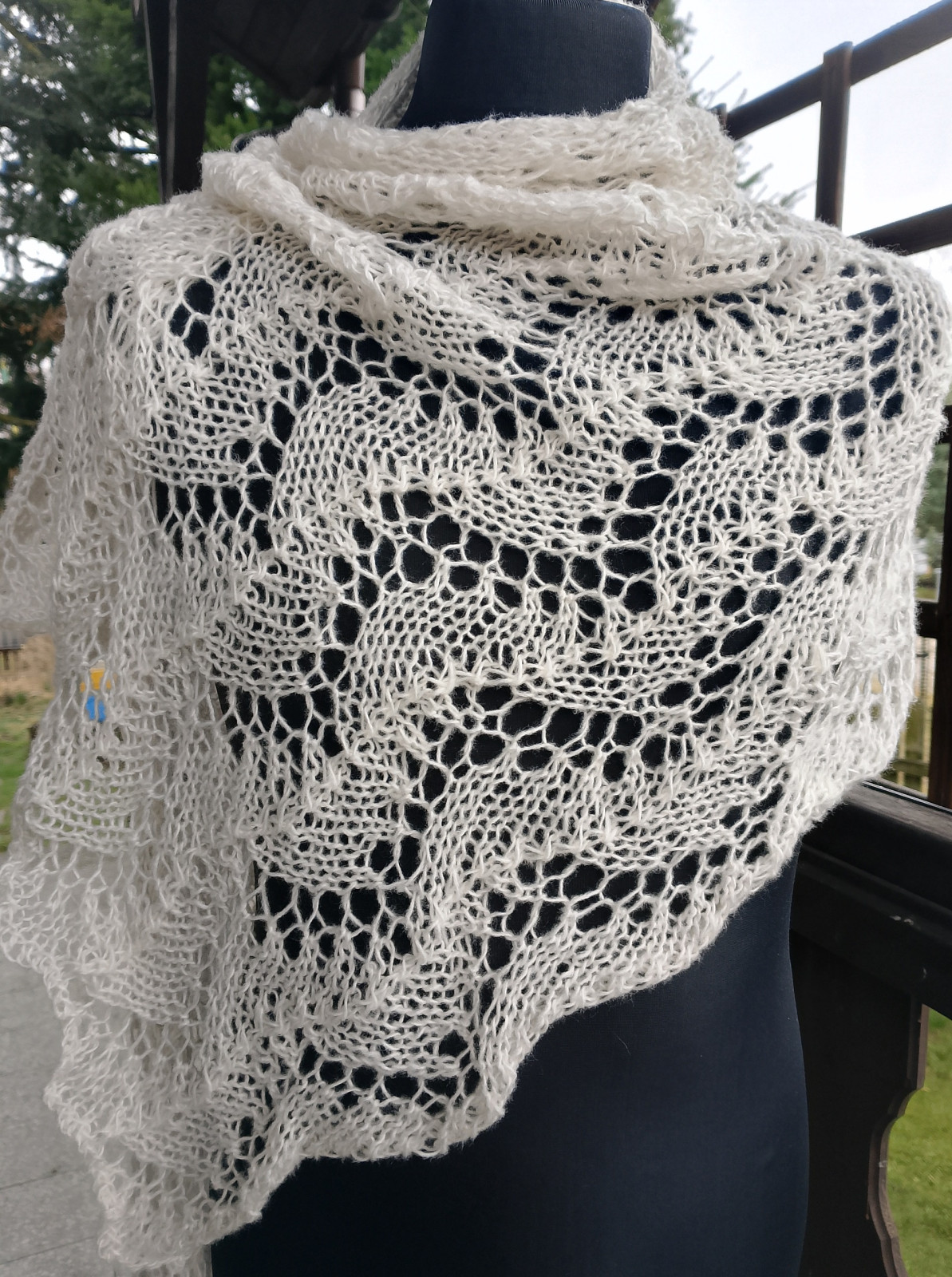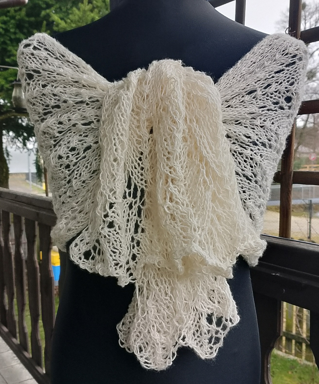 Wyjątkowo piękny szal wykonany w całości ręcznie. Użyto moheru, bardzo delikatnego w dotyku. Szal jest leciutki i ulotny jak mgiełka, a przy tym ciepły. Jest także plastyczny, dzięki czemu można kształtować go na wiele sposobów. Doda uroku każdej stylizacji - ślubnej, wieczorowej, codziennej