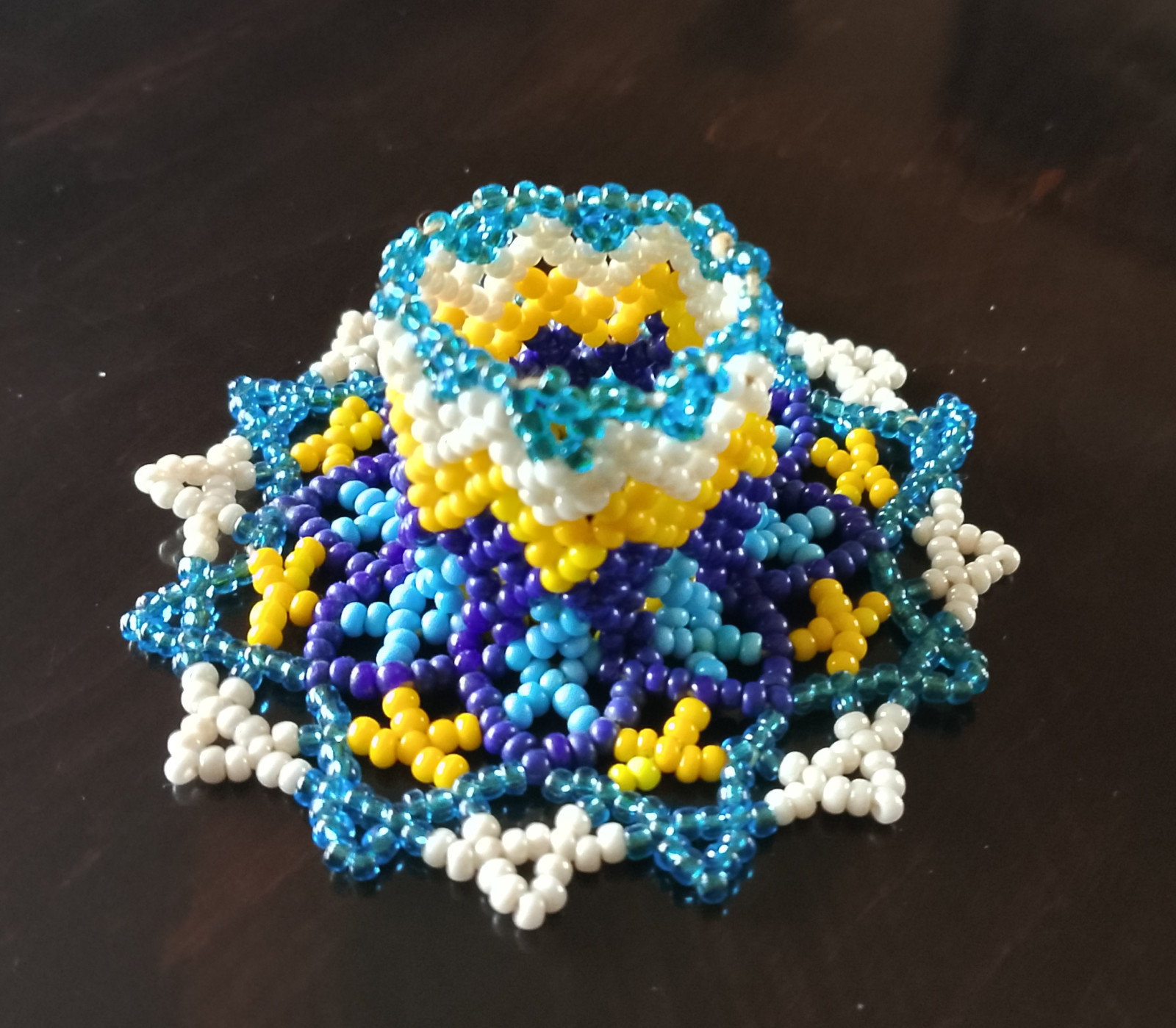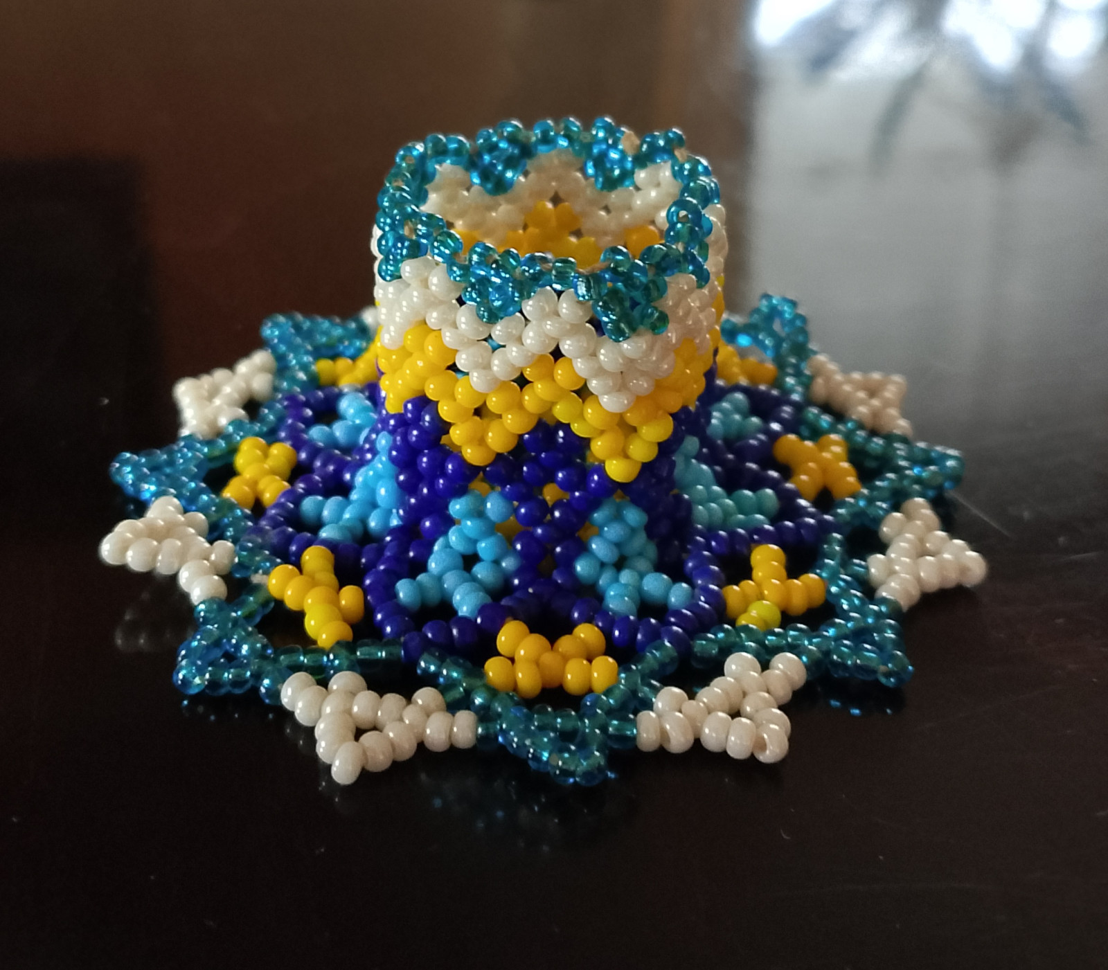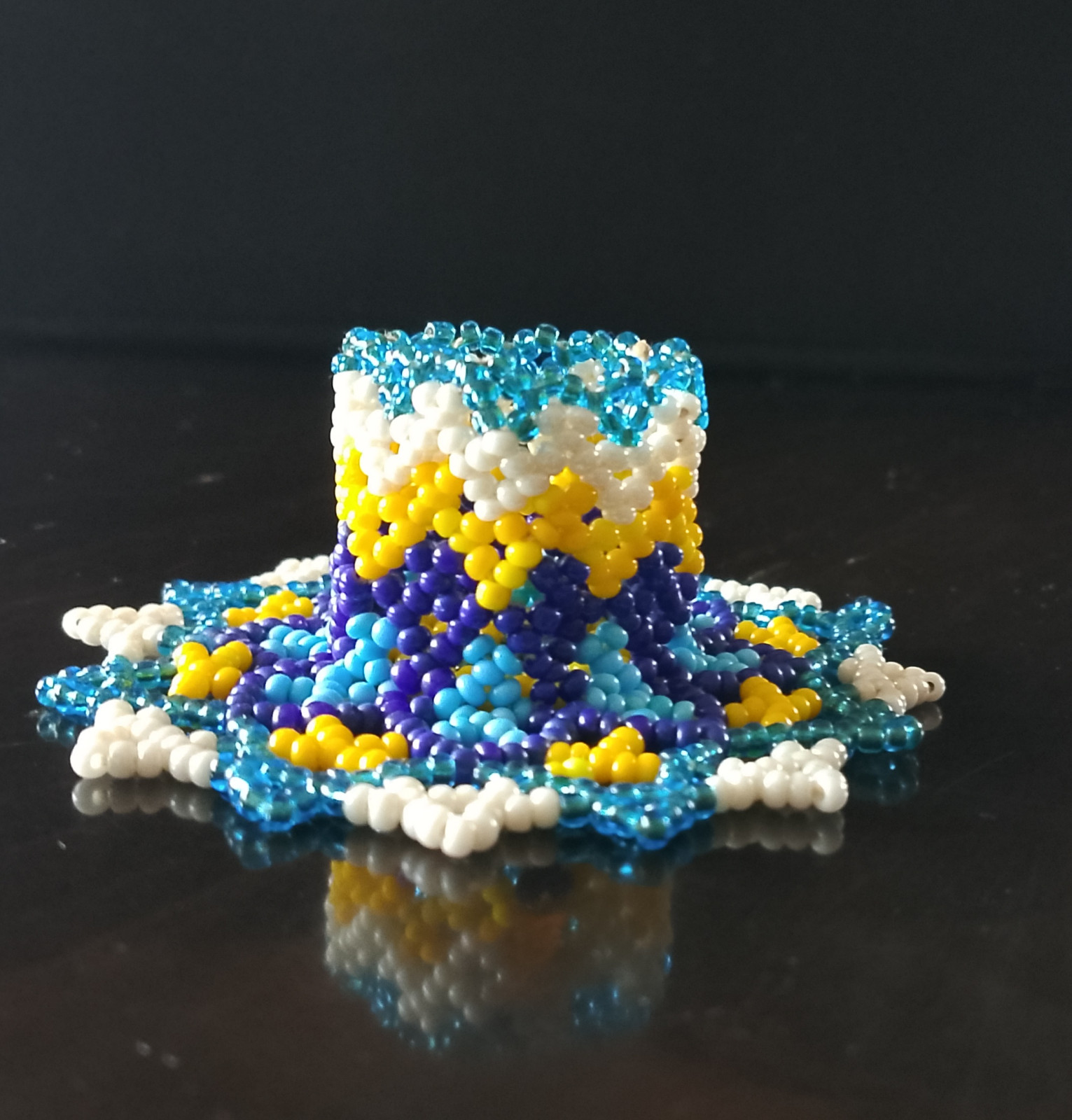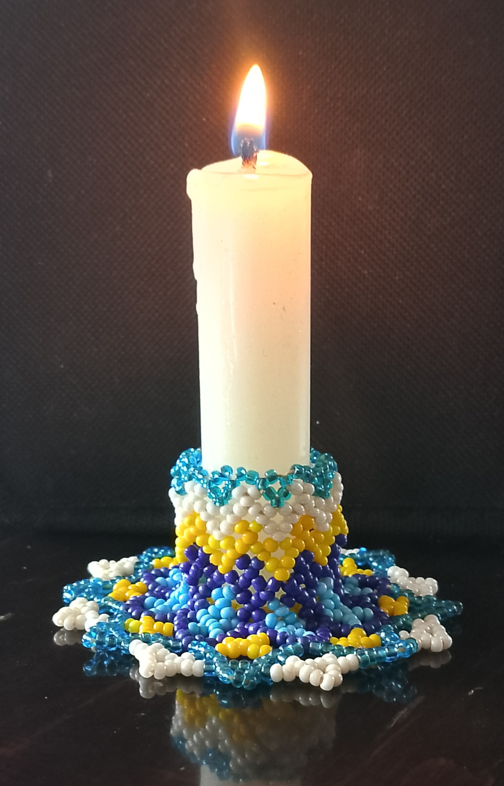 Wyjątkowy, przepiękny świecznik wykonany ręcznie z najwyższą precyzją z koralików TOHO. Średnica 8 cm, wysokość 3 cm, pasuje do świecy o średnicy ok 2,5 - 2,8 cm. Jest unikatem, powstał wyłącznie w jednym egzemplarzu.