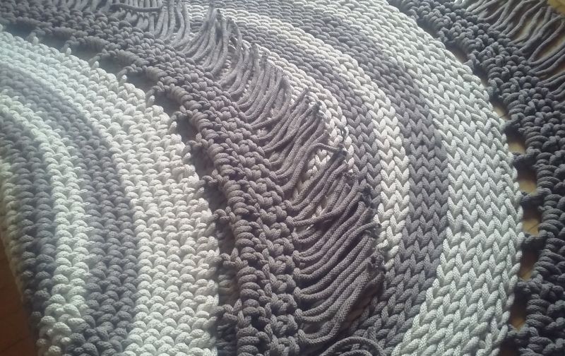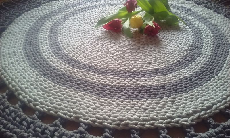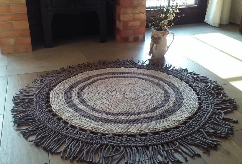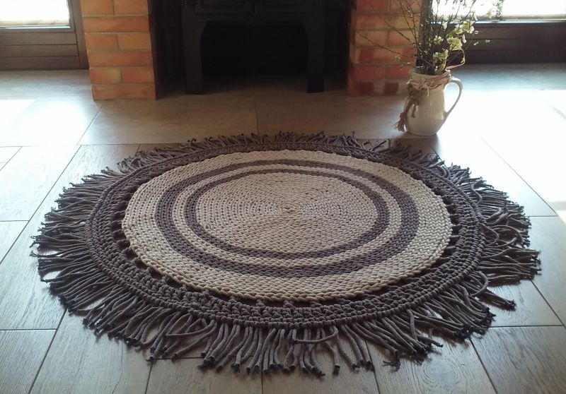 Dywan Camila o średnicy 120 cm, grubość ok. 1,8 cm. Zastosowany wzór (tzw. wielbłądzi) sprawia, że dywan jest bardzo mięsisty, elastyczny a jednocześnie delikatny w dotyku. Kolor ciepłego beżu i mokka. Starannie wykonany i wykończony, dzięki czemu może z powodzeniem być eksponowany również na drugiej stronie. Zakończony ozdobnym brzegiem z frędzlami, nie wywija się i ładnie układa. Oryginalna ozdoba mieszkania, nada mu wyjątkowego charakteru. Zastosowany materiał - 5mm sznurek bawełniany bezpieczny również dla dzieci z alergią. Można prać w temp.30 st, suszyć na leżąco.