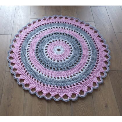 Dywan mandala wykonany ręcznie, dwustronny. Średnica 110 cm. Będzie oryginalną ozdobą salonu lub pokoju dziecięcego. Zastosowany materiał - 5 mm sznurek w 100% bawełniany bezpieczny również dla dzieci z alergią. Sznurek najwyższej jakości wyłącznie od polskich producentów. Można prać w temp.30 st. suszyć na leżąco.