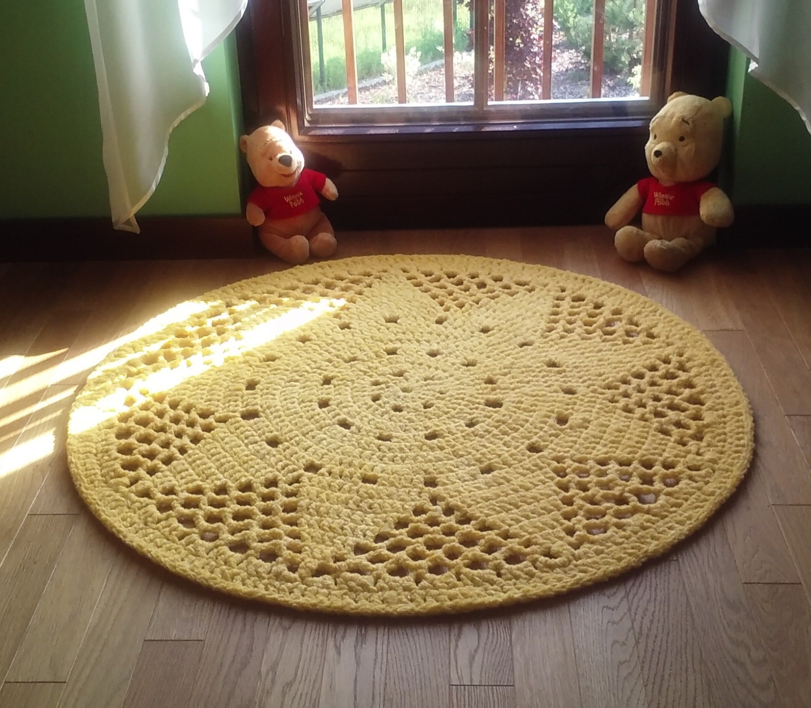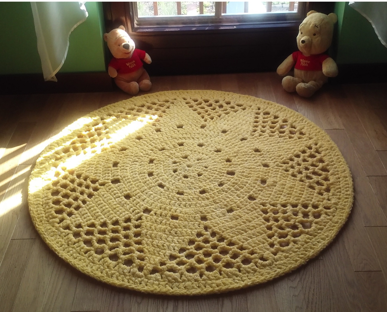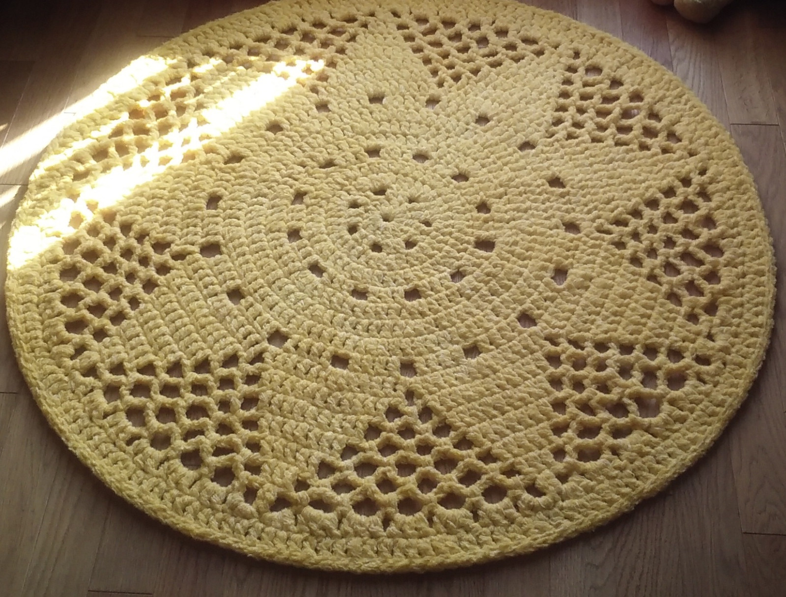 Dywan Słoneczko wykonany ręcznie, zakończony wzmocnionym brzegiem. Średnica 110 cm, kolor żółty.
