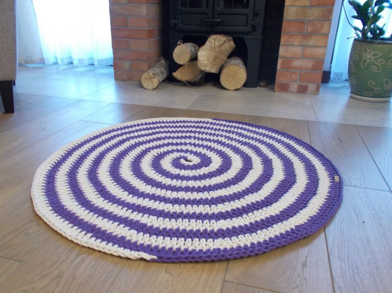 Dywan wykonany ręcznie, dwustronny. Średnica 110 cm. Będzie oryginalną ozdobą salonu lub pokoju dziecięcego. Zastosowany materiał - 5,5 mm sznurek w 100% bawełniany bezpieczny również dla dzieci z alergią. Sznurek najwyższej jakości wyłącznie od polskich producentów. Można prać w temp.30 st. suszyć na leżąco.