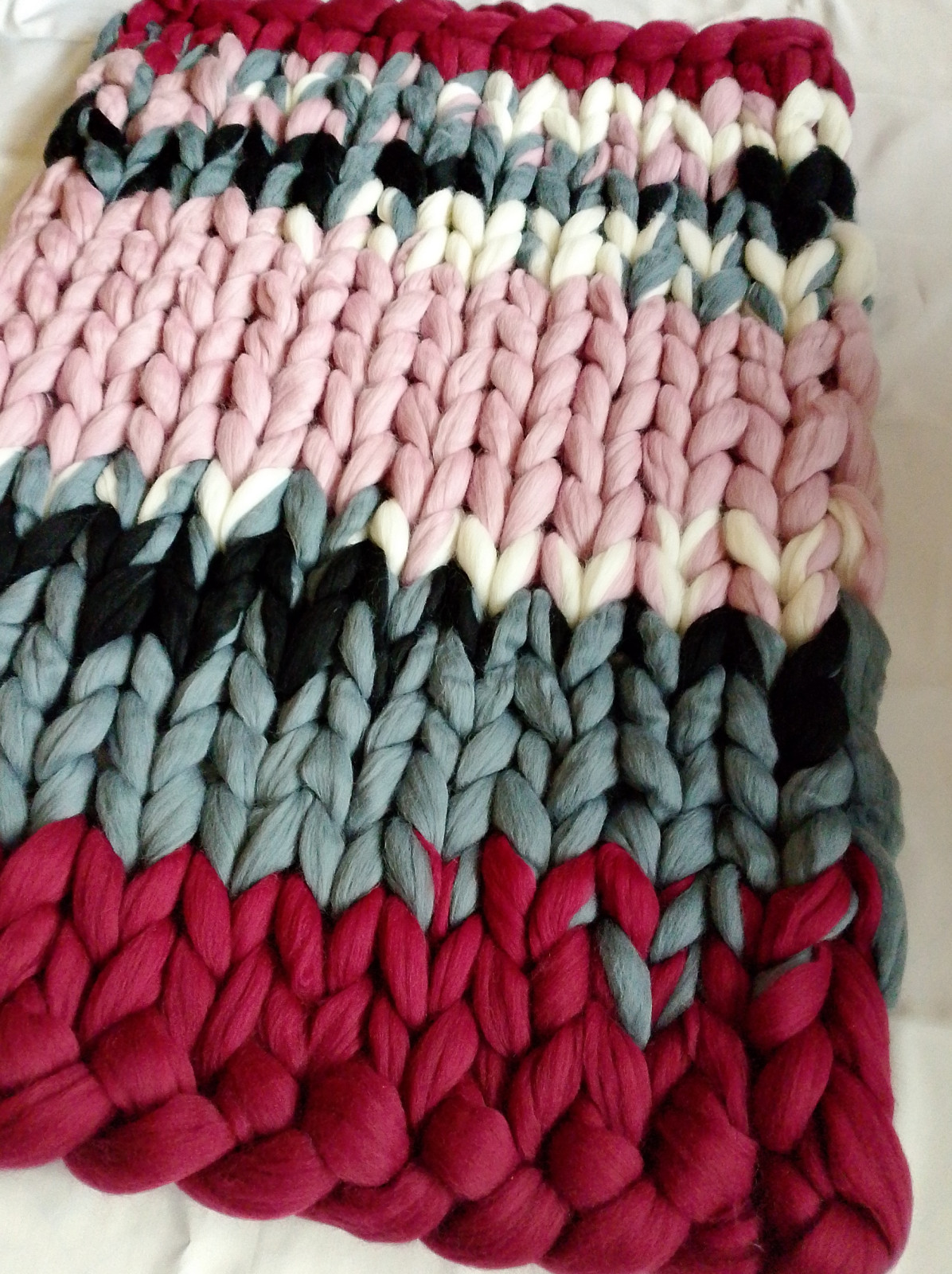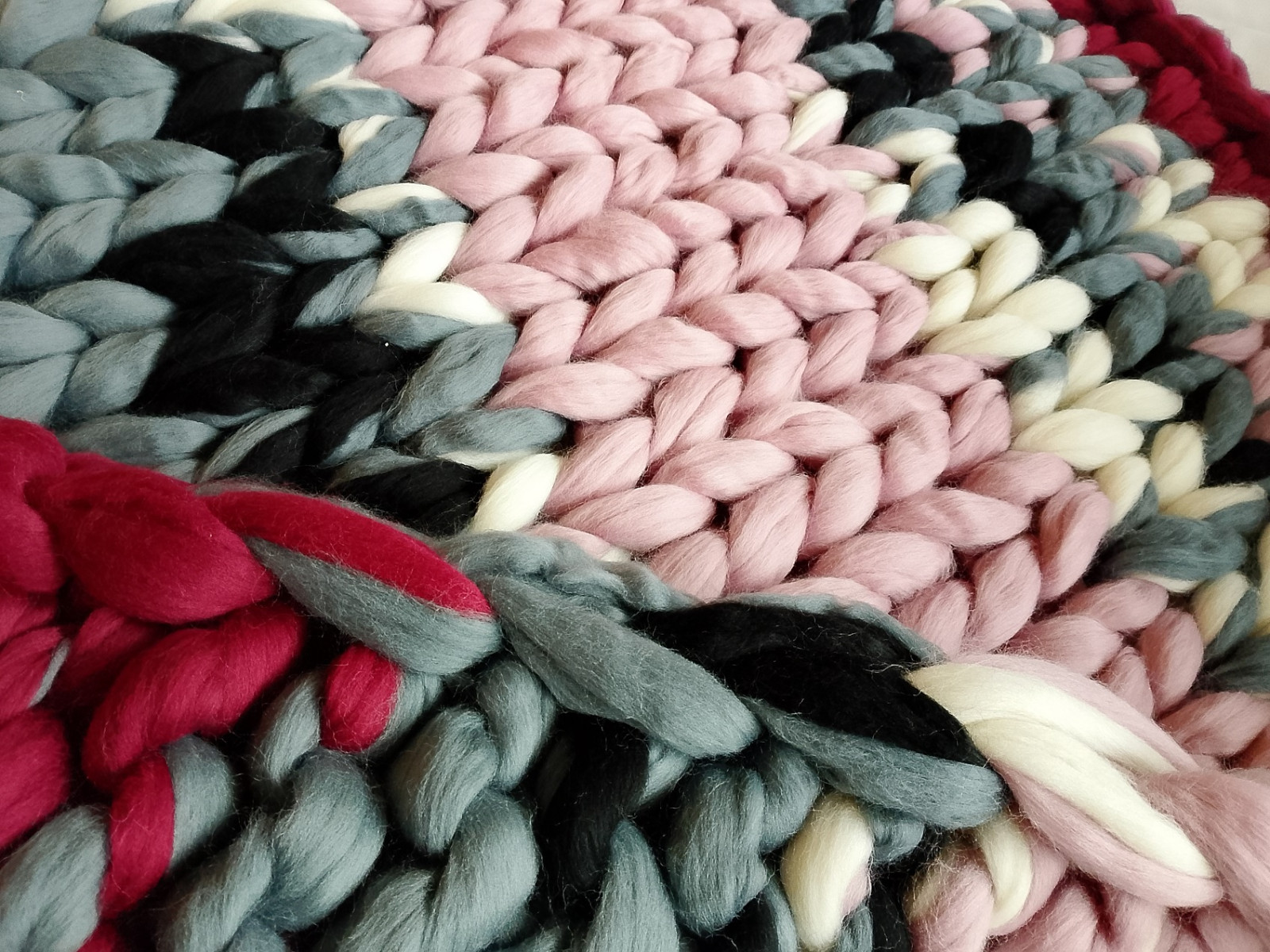 Wymiary: 90 cm x 115 cm. Kolory, bordowy, szary, ecru, czarny, brudny róż. Skład: 100 % wełna owcza z merynosa wyłącznie od polskich producentów.