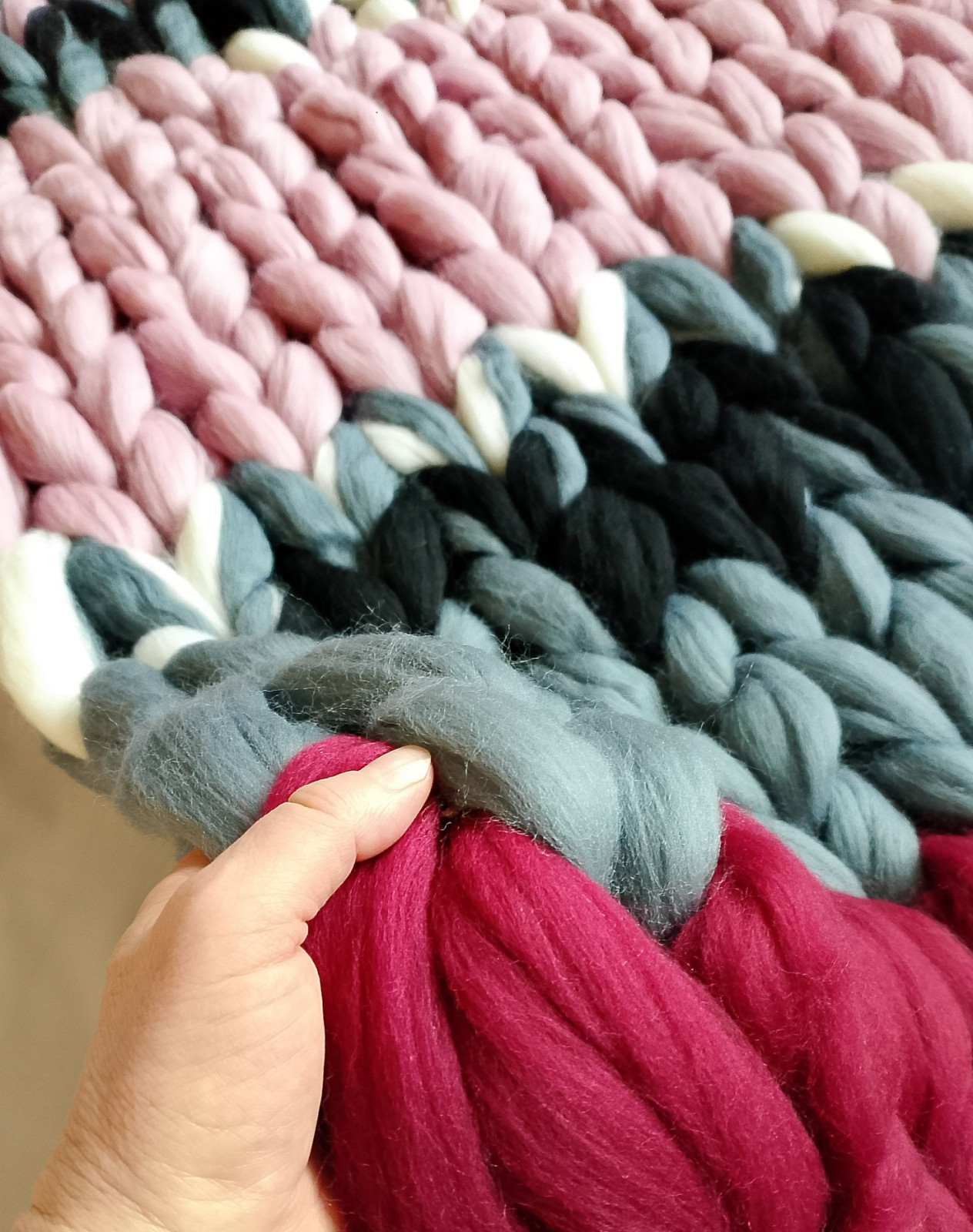 Koc wykonany ręcznie z wysokiej jakości wełny czesankowej z merynosów. Jest niezwykle efektowny, ma piękny połysk i nie tylko ozdobi każde wnętrze, ale także spełni funkcję użytkową w chłodne dni. Jest bardzo delikatny w dotyku a jednocześnie ciepły i przytulny.