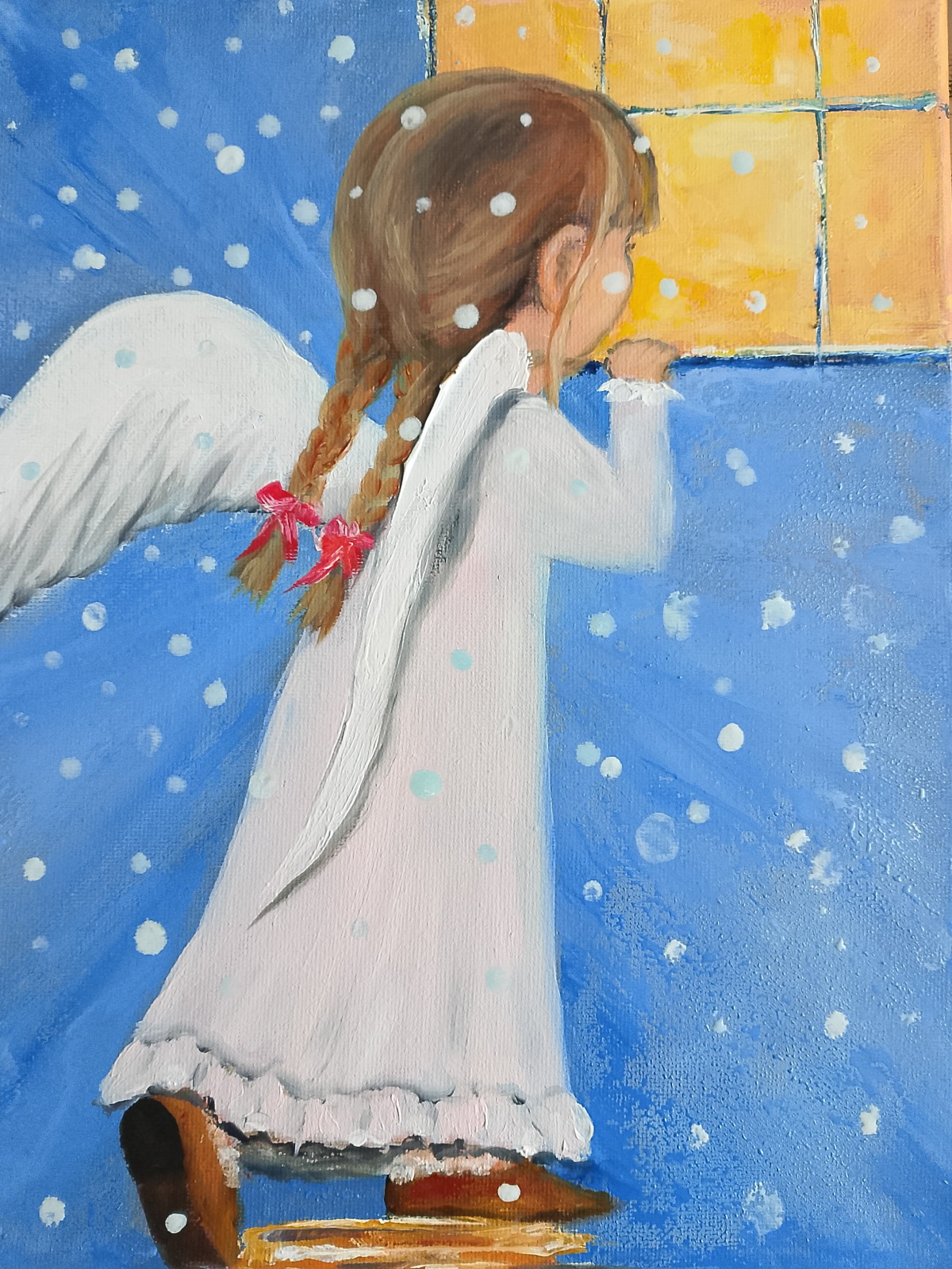 Aniołek Dziewczynka - ręcznie malowany obraz olejny. Płótno na blejtramie. Obraz nie wymaga oprawy - posiada boki zamalowane w formie kontynuacji, co sprawia wrażenie jego przestrzenności. Wymiary 24 cm x 30 cm. Sygnowany. Na życzenie do obrazu dołączony Certyfikat autentyczności.