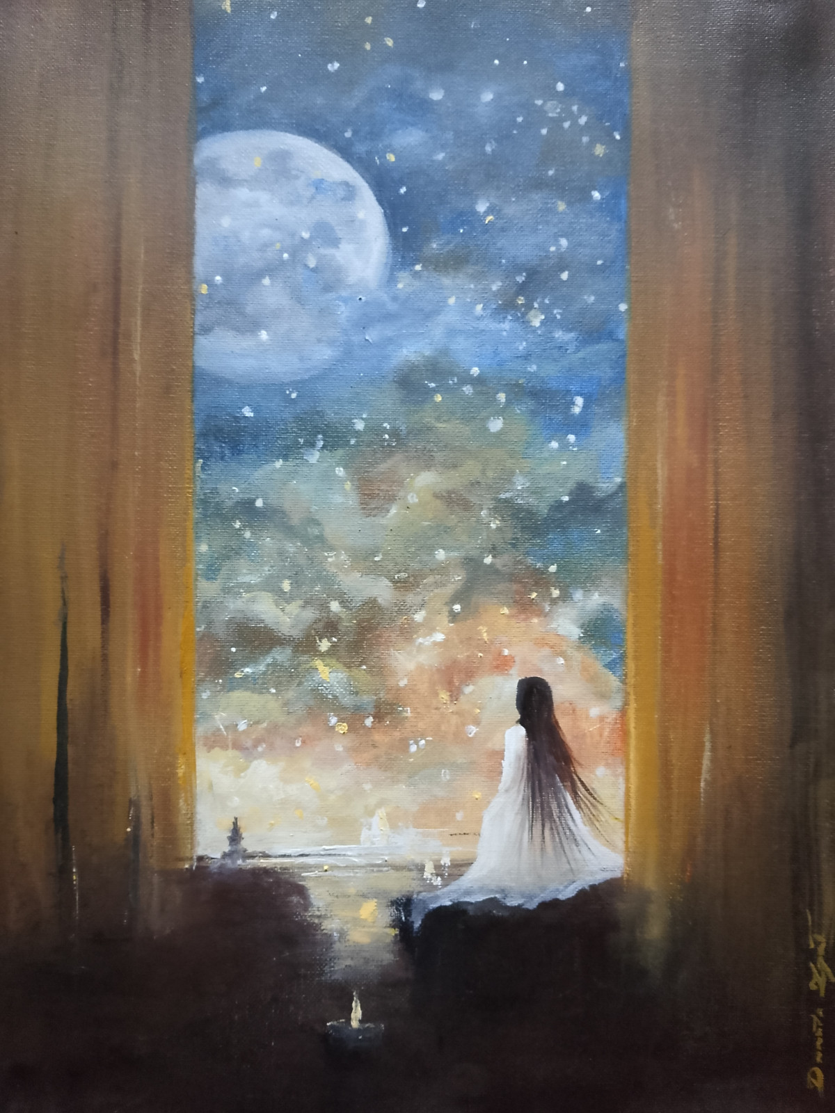 Oczekiwanie - ręcznie malowany obraz olejny. Płótno na blejtramie. Obraz ma zamalowane boki w formie kontynuacji i nie wymaga oprawiania w ramę.