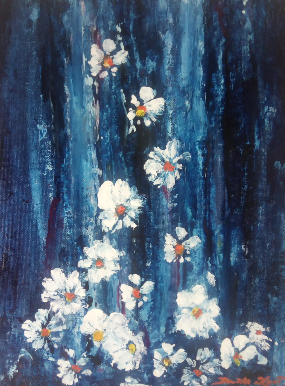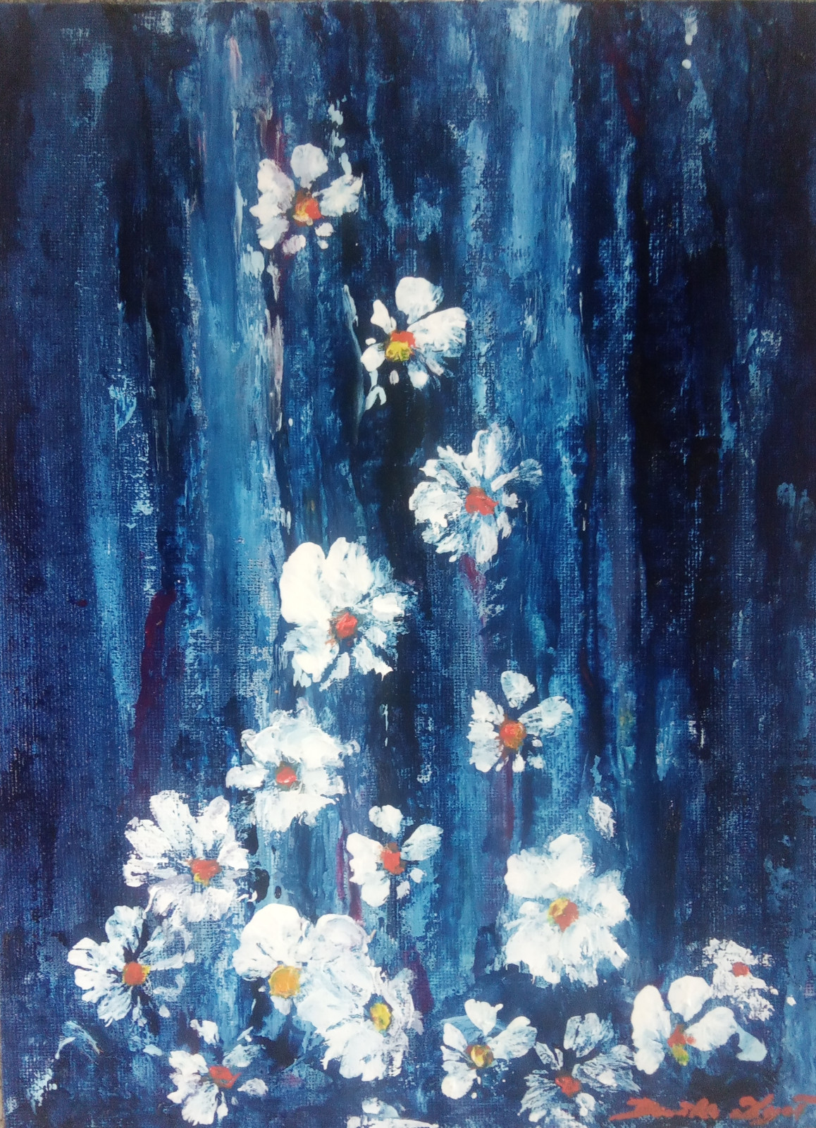 Wodospad z kwiatów - autorski obraz olejny o wymiarach 23 x 30,5 cm, sygnowany. Do wykonania obrazu użyto podobrazia malarskiego wykonanego ze sztywnej 2 milimetrowej sklejki, na którą zostało trwale przyklejone bawełniane płótno o fakturze lnianej kanwy, gruntowane profesjonalnym gruntem typu gesso. Dzięki niewielkiej grubości podobrazia, obraz może zostać oprawiony w dużo płytsze, a przez to tańsze ramy. Do obrazu dołączony Certyfikat autentyczności.