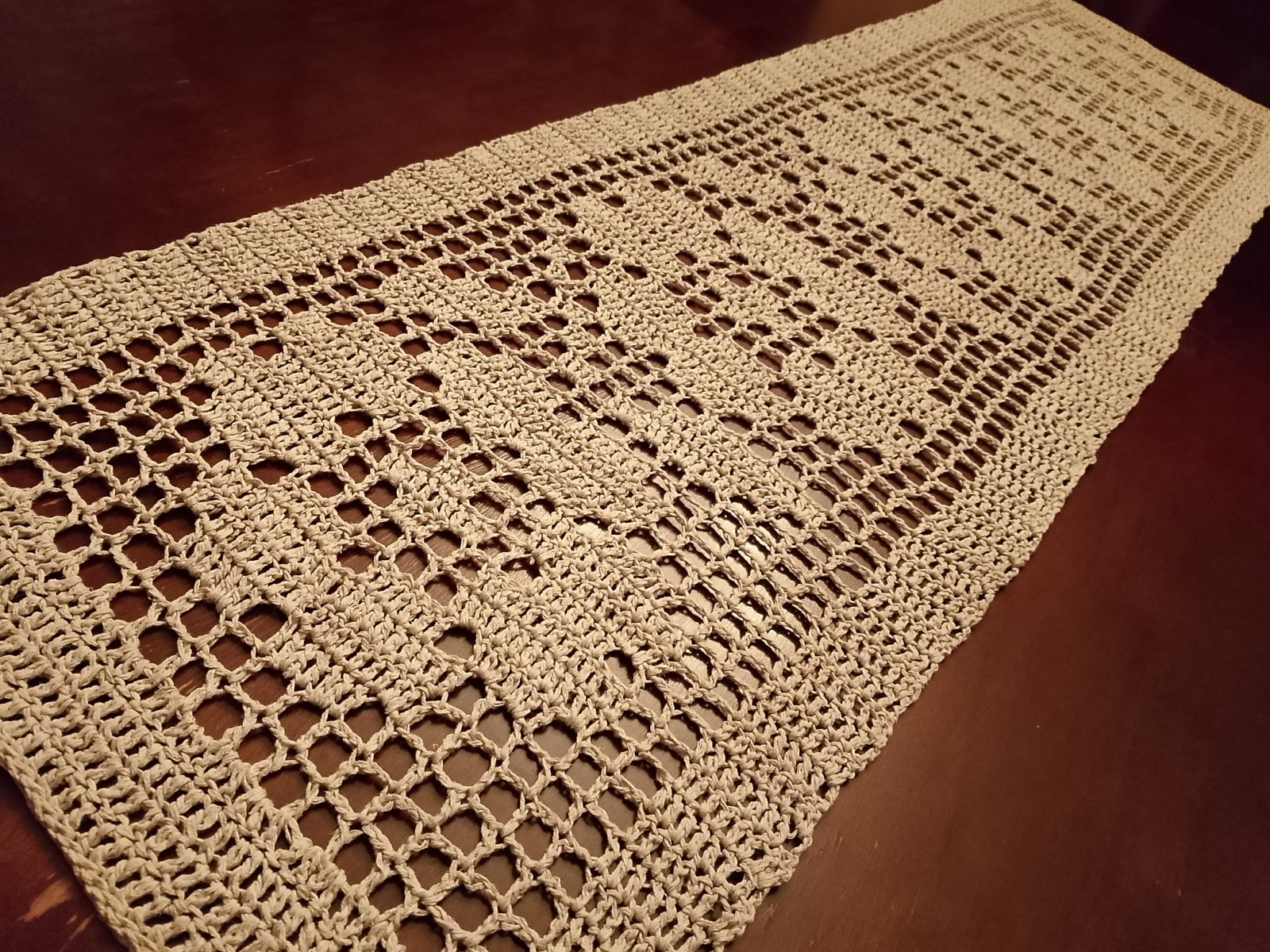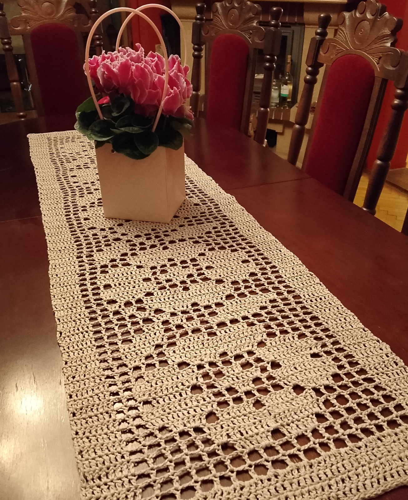 Bieżnik w romantyczne kwiaty wykonany ręcznie z bawełnianych nici, w kolorze beżowym. Szczególnie dobrze prezentuje się na długim stole. Może także stać się oryginalnym a jednocześnie praktycznym prezentem.