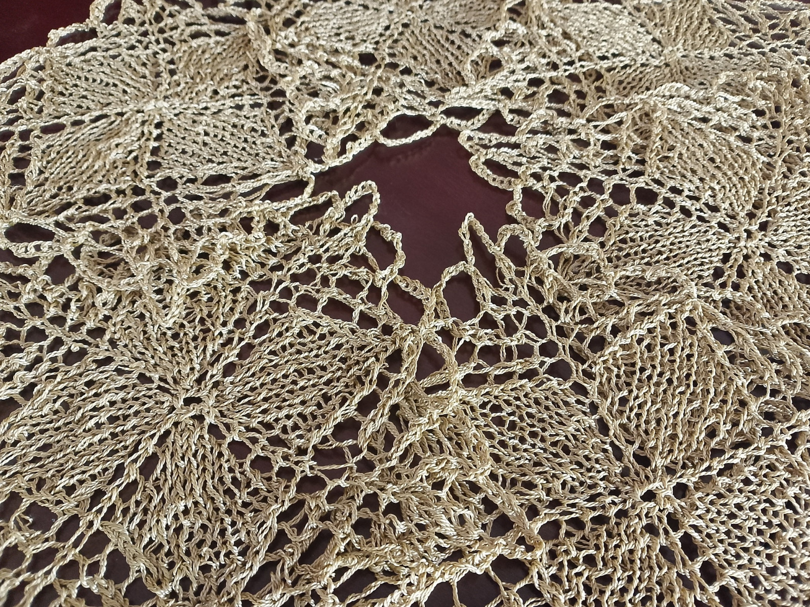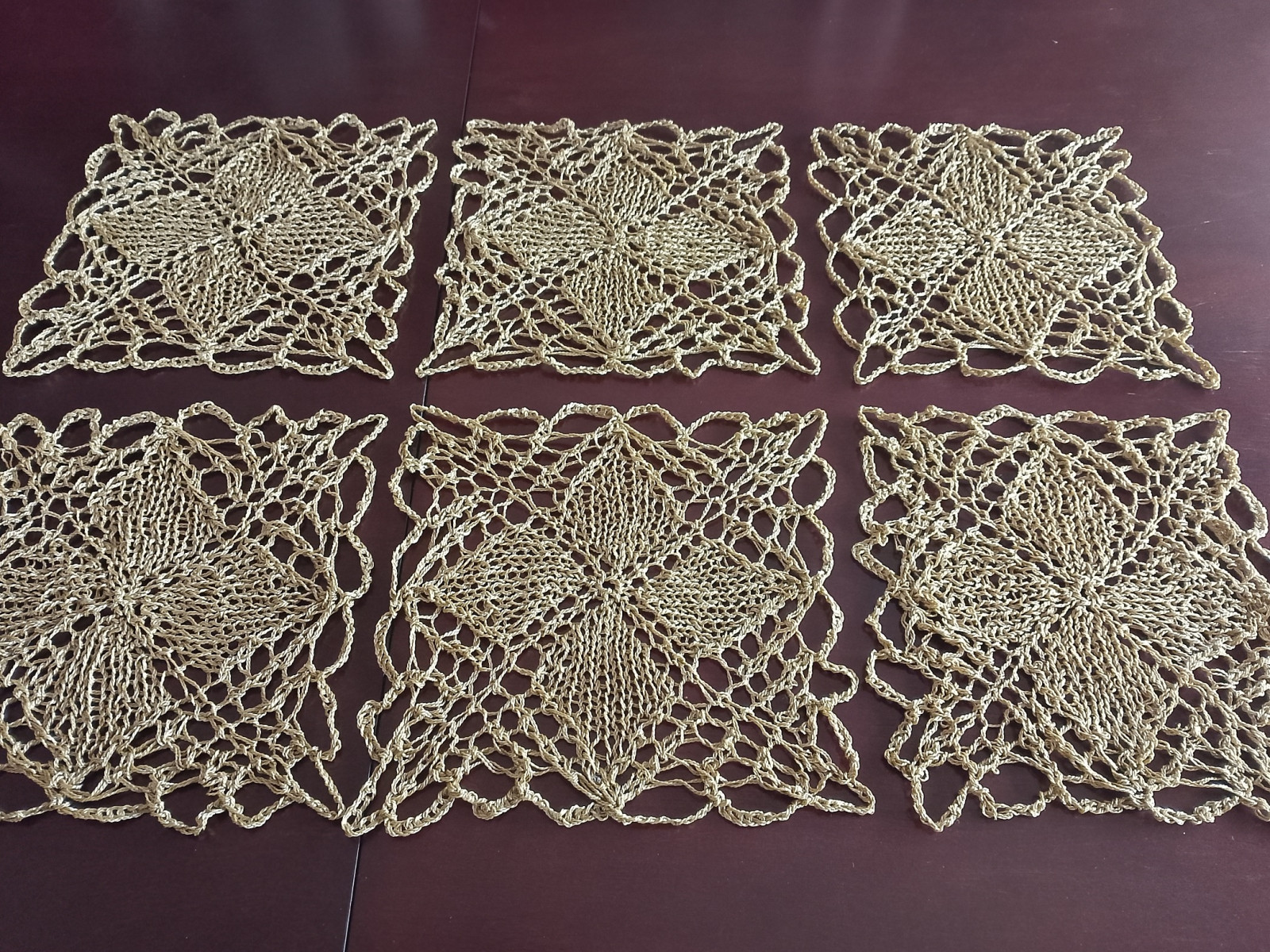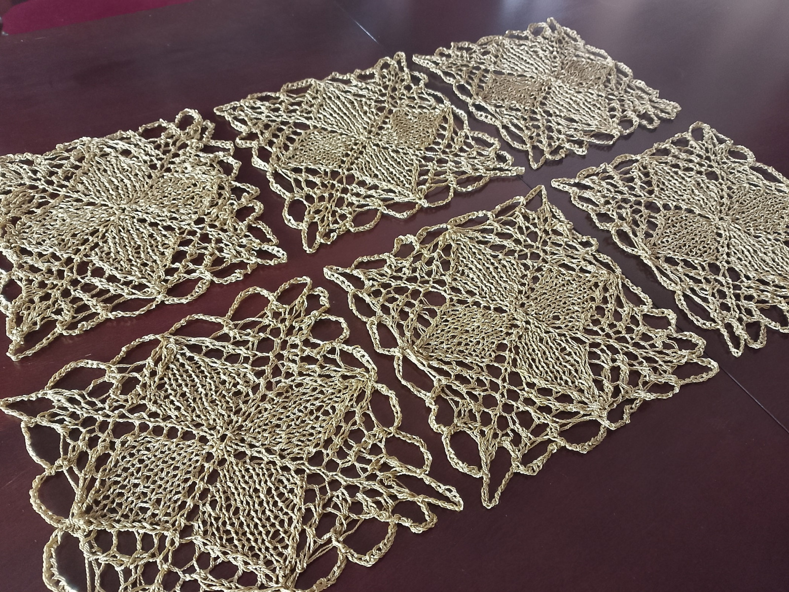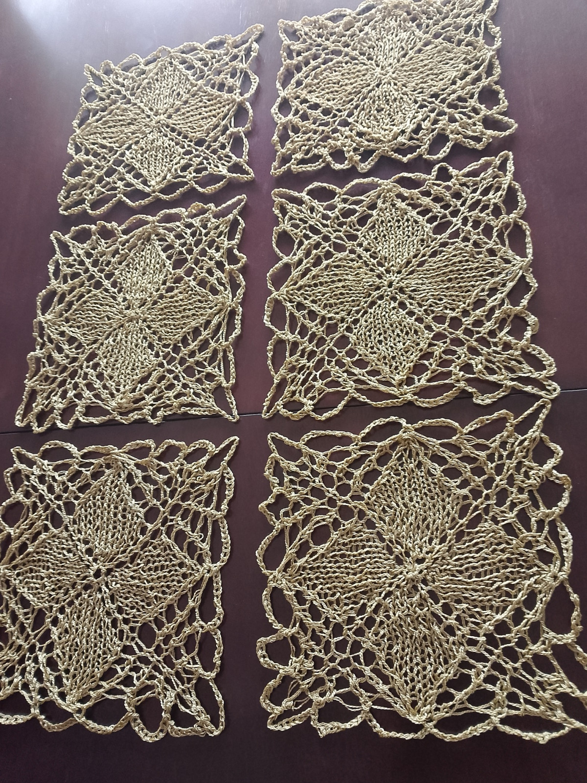 Komplet 6 szt serwetek podkładek wykonanych ręcznie na drutach w kolorze starego złota z połyskiem. Będą oryginalną i niezwykłą ozdobą mieszkania, ponieważ koronki robione na drutach są wyjątkowo delikatne i mają niecodzienny urok. Dodatkowo wyróżnia je technika wykonania, która obecnie jest rzadkością z uwagi na trudność i pracochłonność.