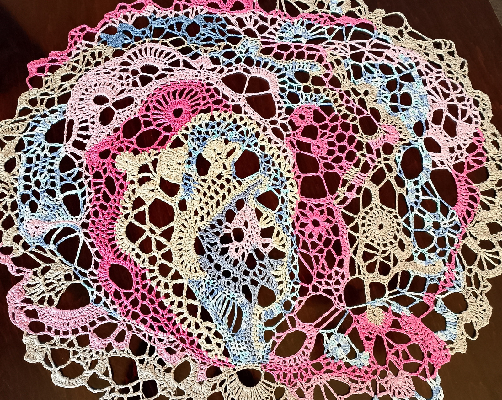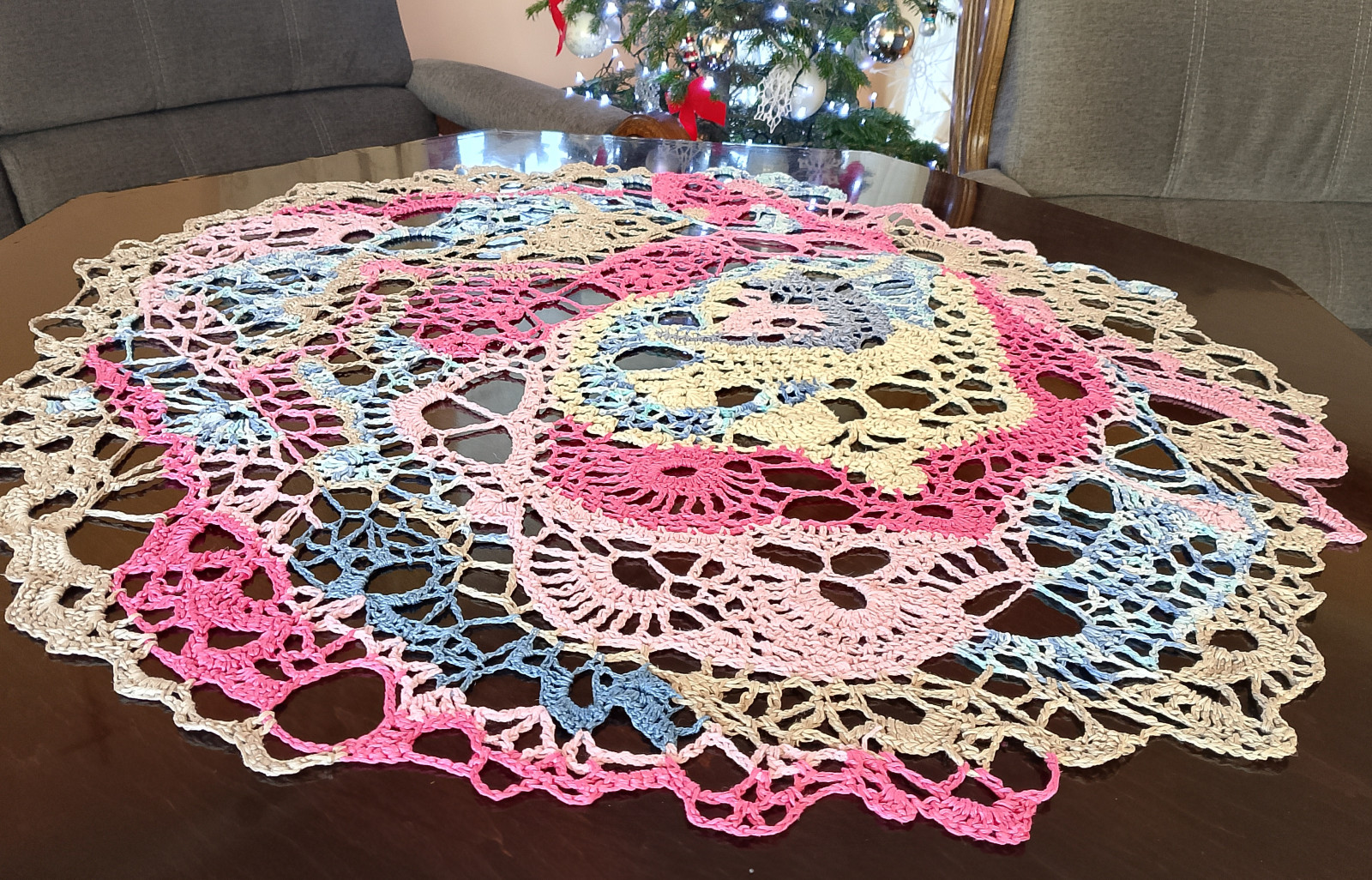 Wyjątkowy obrus wykonany w całości ręcznie w formie kolorowej abstrakcji. Freeform crochet to technika tworzenia rękodzieła szydełkiem, która nie opiera się na żadnych wzorach czy schematach, pozwalając na całkowitą swobodę twórczą, łączenie różnych ściegów, kolorów i faktur w asymetryczne, unikalne formy. Polega na intuicyjnym dzierganiu i tworzeniu artystycznych kolorowych, organicznych kształtów.