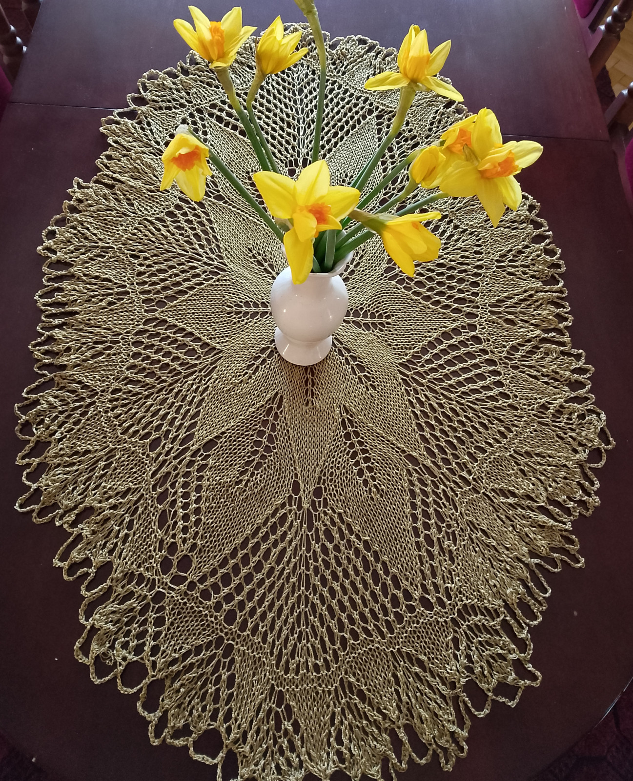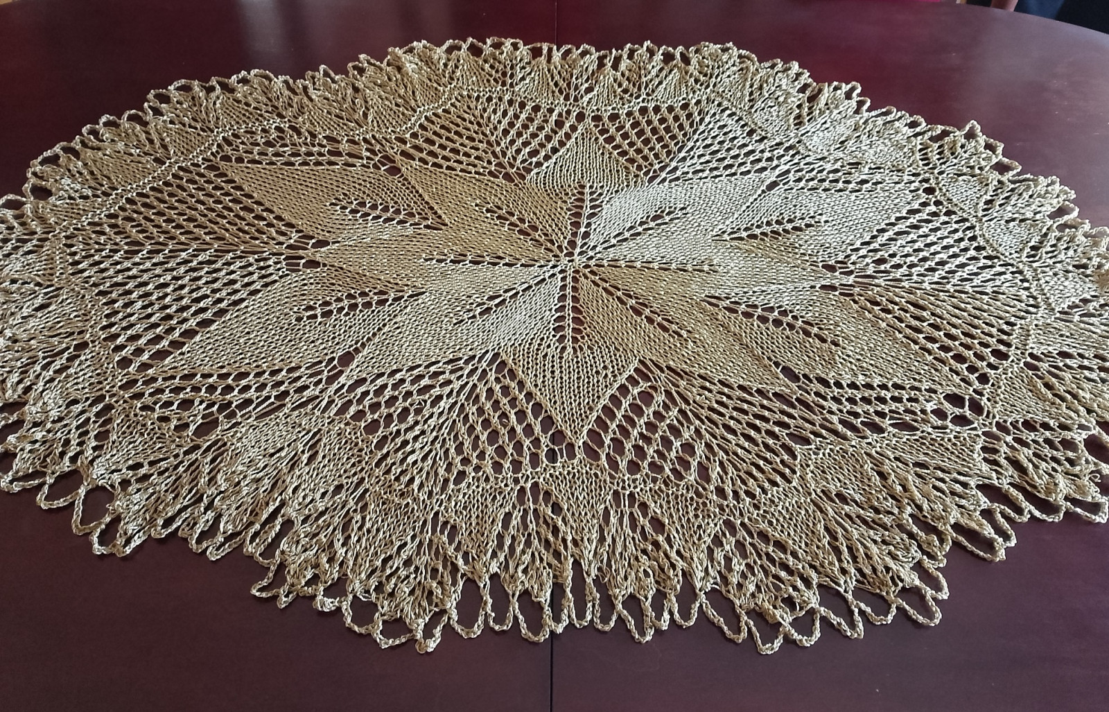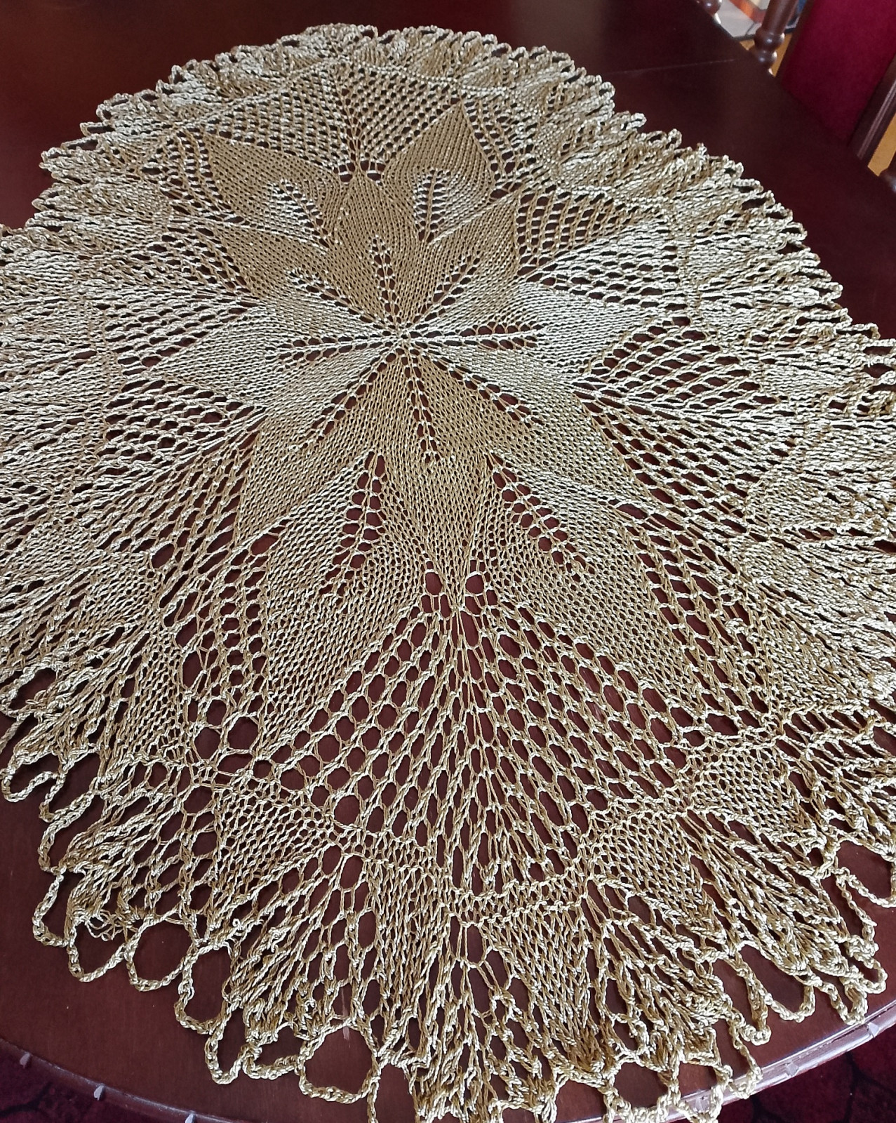 Obrus koronkowy wykonany ręcznie na drutach w kolorze starego złota z połyskiem. Będzie oryginalną i niezwykłą ozdobą mieszkania, ponieważ koronki robione na drutach są wyjątkowo delikatne i mają niecodzienny urok. Dodatkowo wyróżnia je technika wykonania, która obecnie jest rzadkością z uwagi na trudność i pracochłonność.