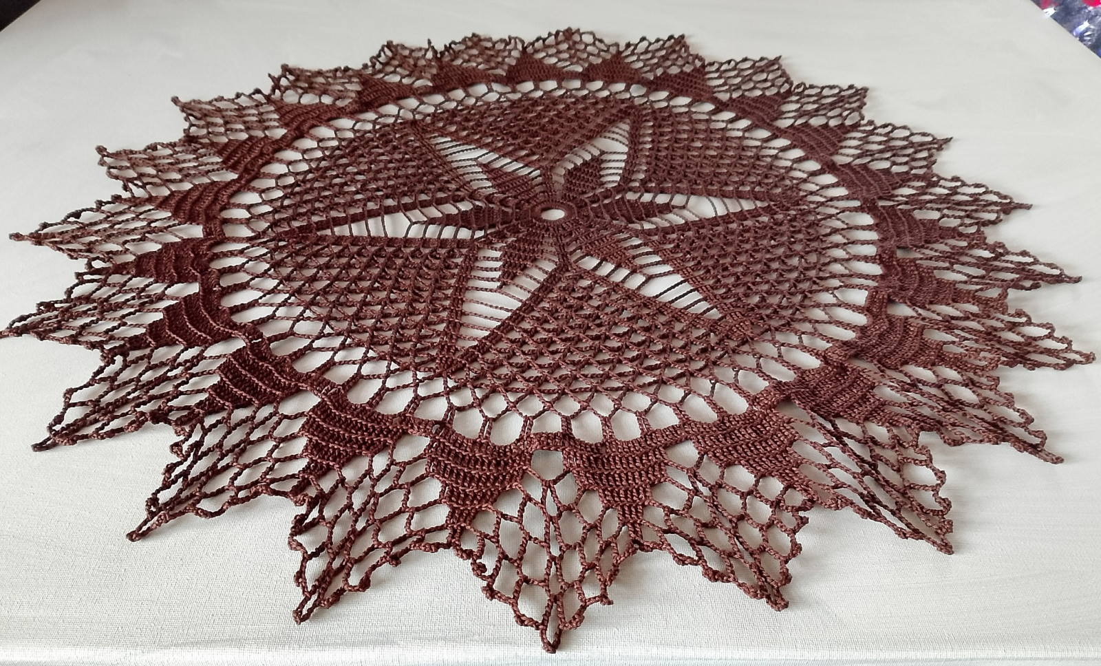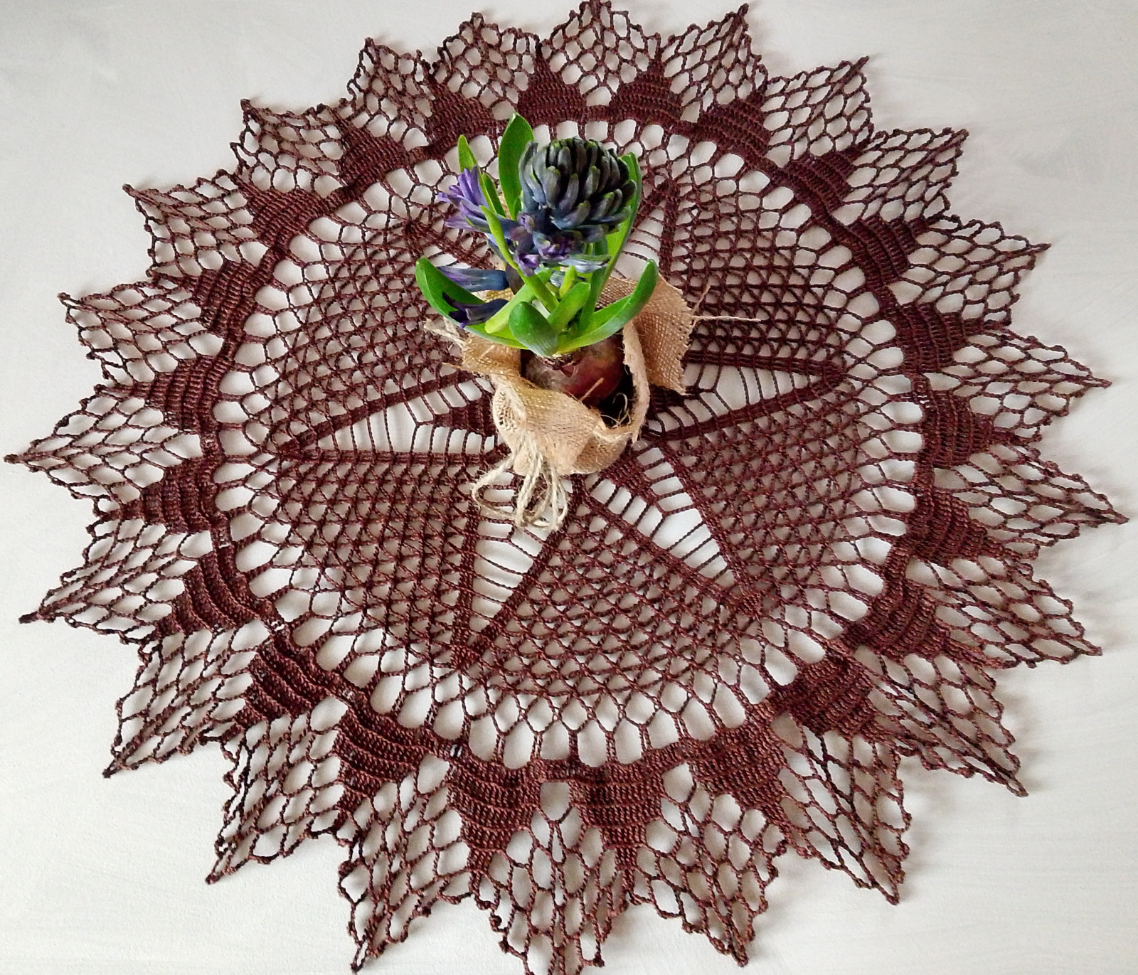 Urocza serwetka wykonana w całości ręcznie z bawełnianego kordonka, pięknym dekoracyjnym wzorem. Usztywniona. Średnica 65 cm, kolor brązowy w odcieniu czekoladowym.