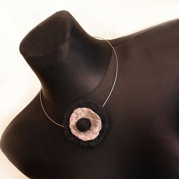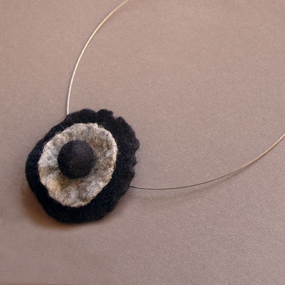 Minimalistyczny choć zwracający uwagę naszyjnik dla dziewczyny, kobiety z polotem, wesołej i romantycznej. Kwiat - makokwiat. Wykonany z ręcznie filcowanej wełny (merino wool). Powieszony na lince jubilerskiej w kolorze z estetycznym małym zapięciem. Wielkość kwiatka ok 7,5x7,5 cm. Obwód naszyjnika łącznie z zapięciem ok 50 cm. Kolory dominujące to jasny szary i czarny. Filc to puszysty i miękki dodatek na każdą porę roku. Polecam i zapraszam.