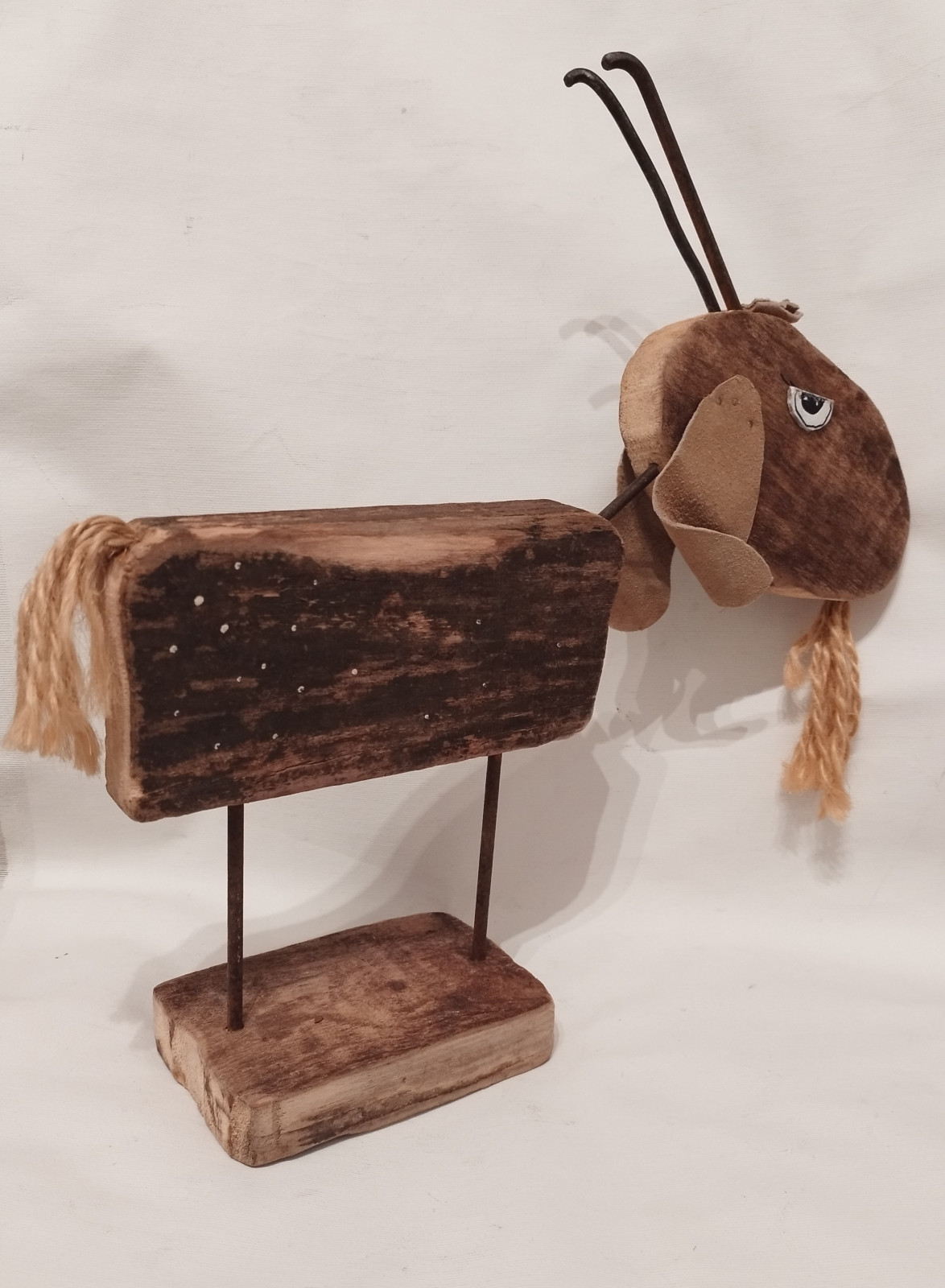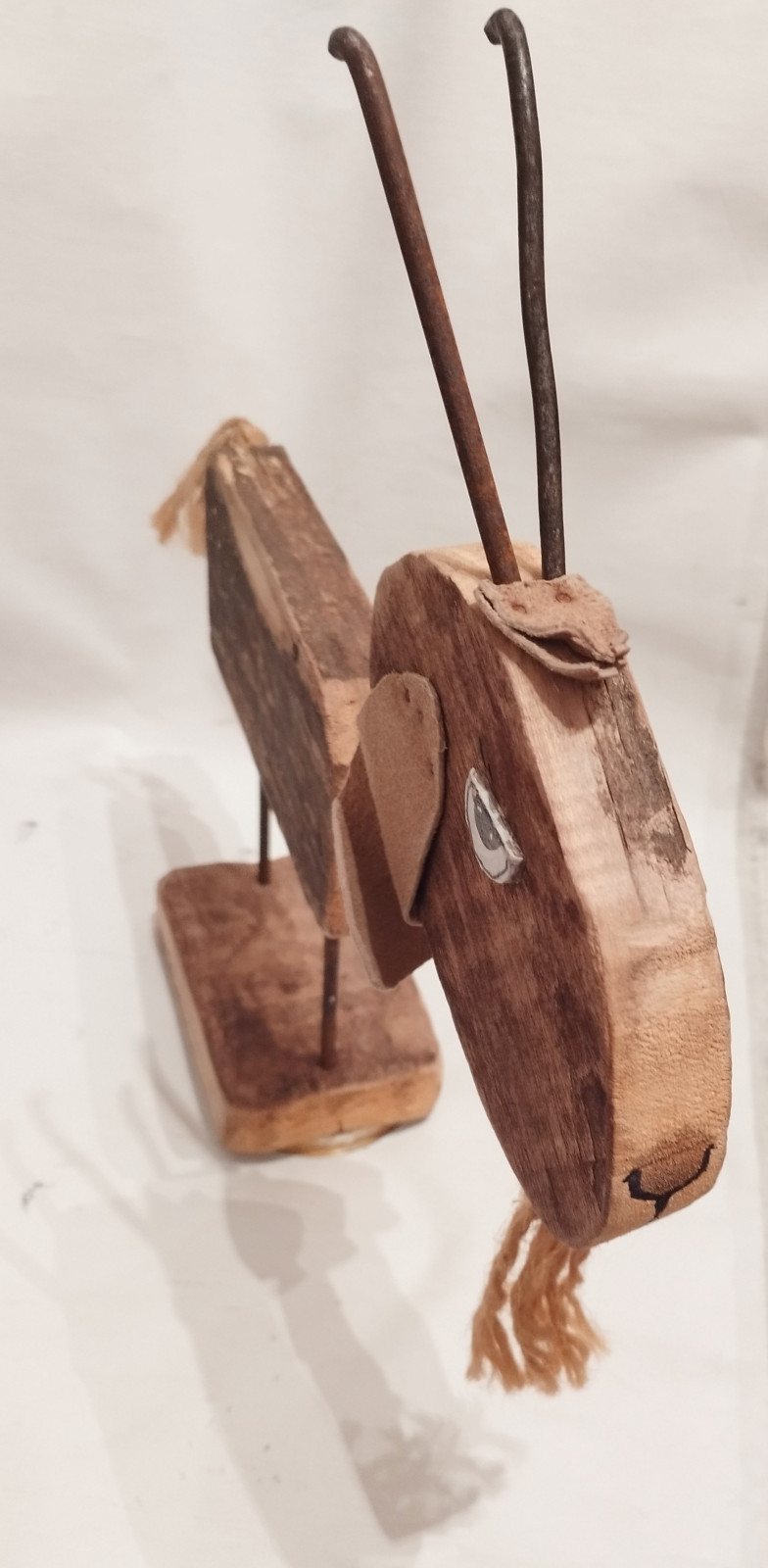 Rzeźba wykonana z drewna, metalu, juty i częściowo malowana. Materiał z recyklingu. Sygnowana.