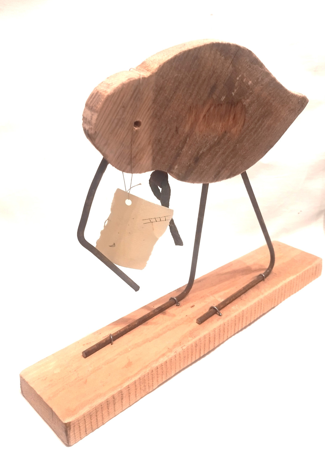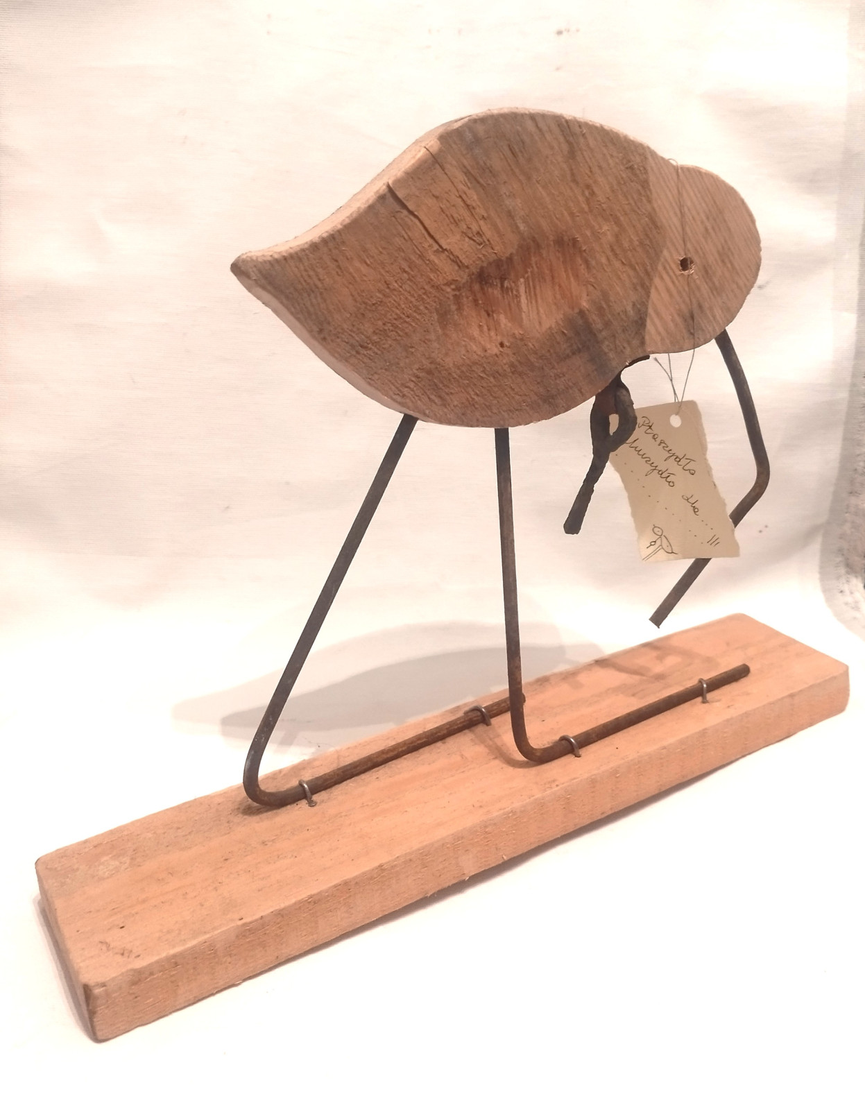 Rzeźba wykonana z drewna i metalu i częściowo malowana. Materiał z recyklingu. Sygnowana.